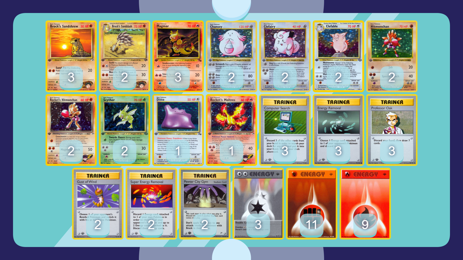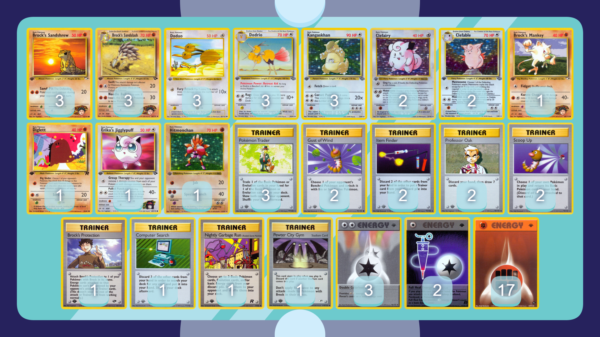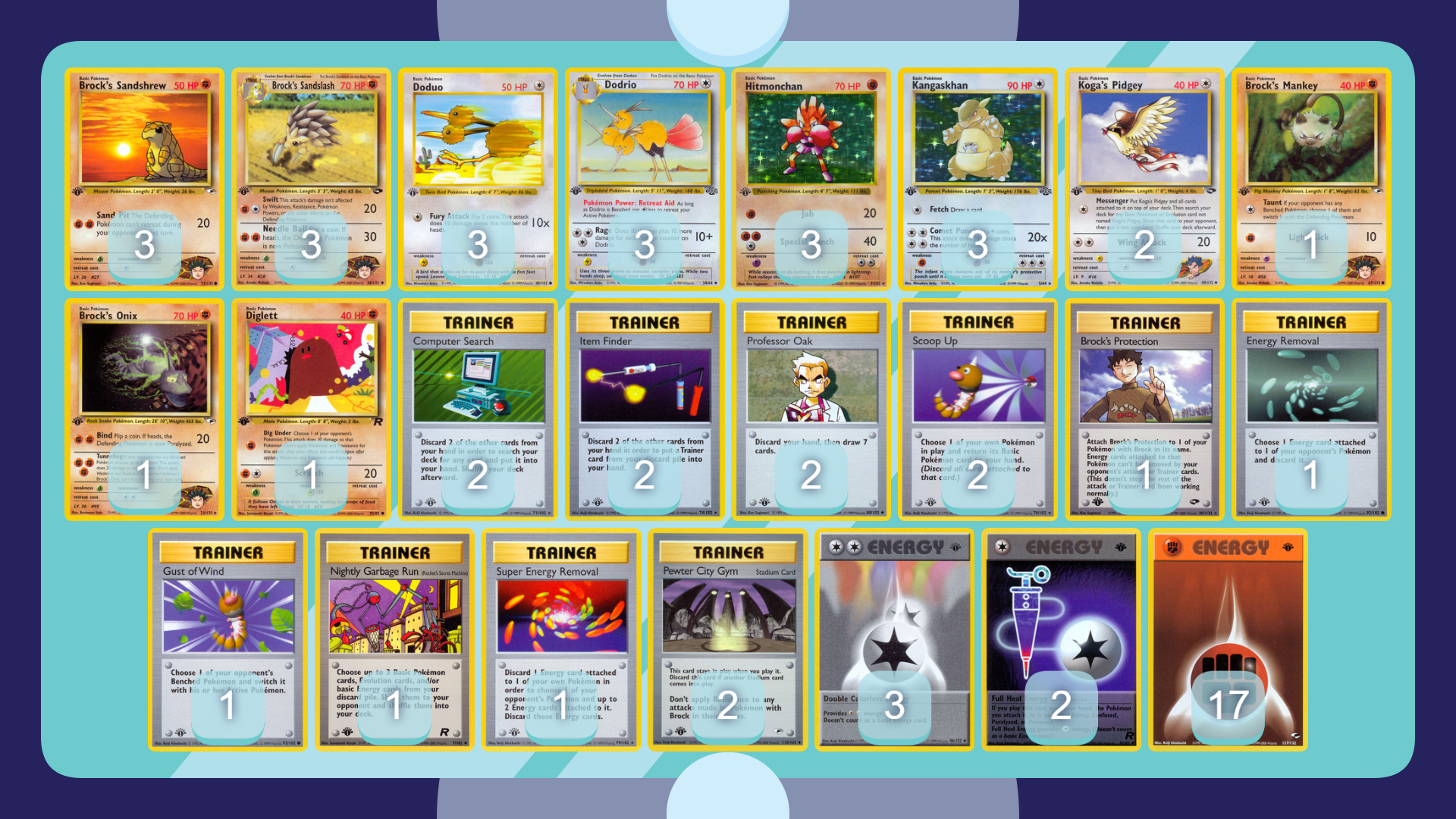 I am toying with trying to include a 2nd Pewter City Gym and/or Item Finder; Pokemon Trader is a potential cut. Also, it feels like the deck may want the third Dodrio or Koga’s Pidgey (49) might also be necessary. Lastly, it is likely the Energy counts are incorrect (but they are likely within 1-2 correct); I’d love to fit a few Full Heal Energy.