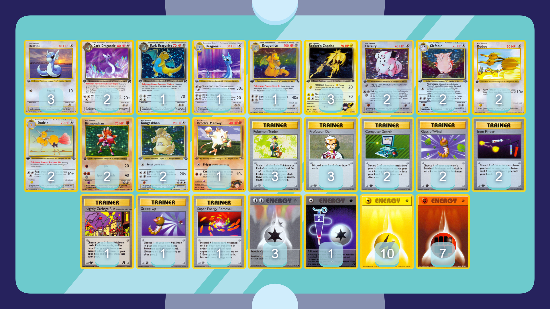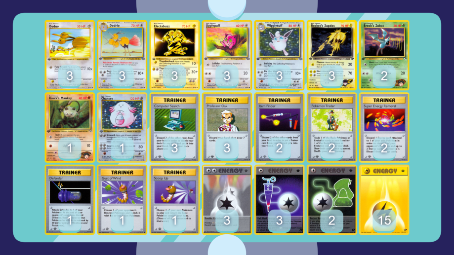 - Power Level – Strong – Rocket’s Zapdos, Clefable, Hitmonchan and Brock’s Mankey can do massive amounts of damage with only one or two Energy cards from hand. Dodrio and Dragonite give the deck extra flexibility to switch between attackers.