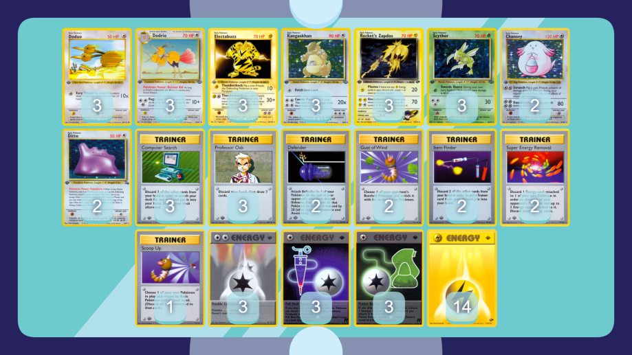 Decks not below that may eventually find competitive lists include: Blastoise, ErikaBox (Erika’s Maids-based Toolbox), Dark Vileplume, Buzzap (Base Set Electrode), Dark Raichu, Potpourri (Weakness-exploiting Basics), Medicate (Lt. Surge’s Raticate & Mr. Mime), Alakazam, and many more