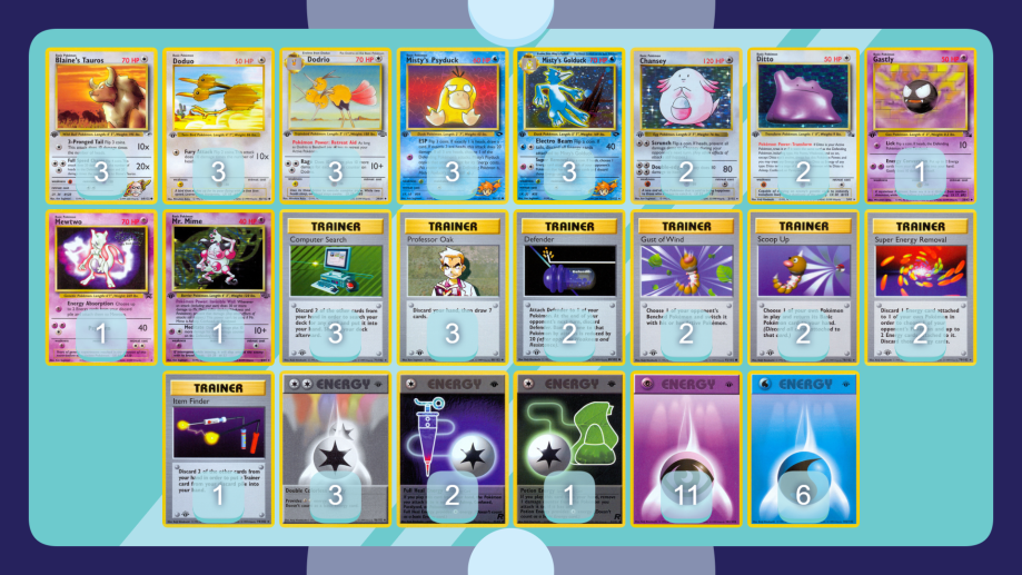 Originally designed as a counter to Fire Blaine’s Rapidash / Wigglytuff / Muk, this deck hits hard when the flips are in its favor: Super Removal success being a very strong attack. There are a lot of options for Energy, Trainers and Basics.