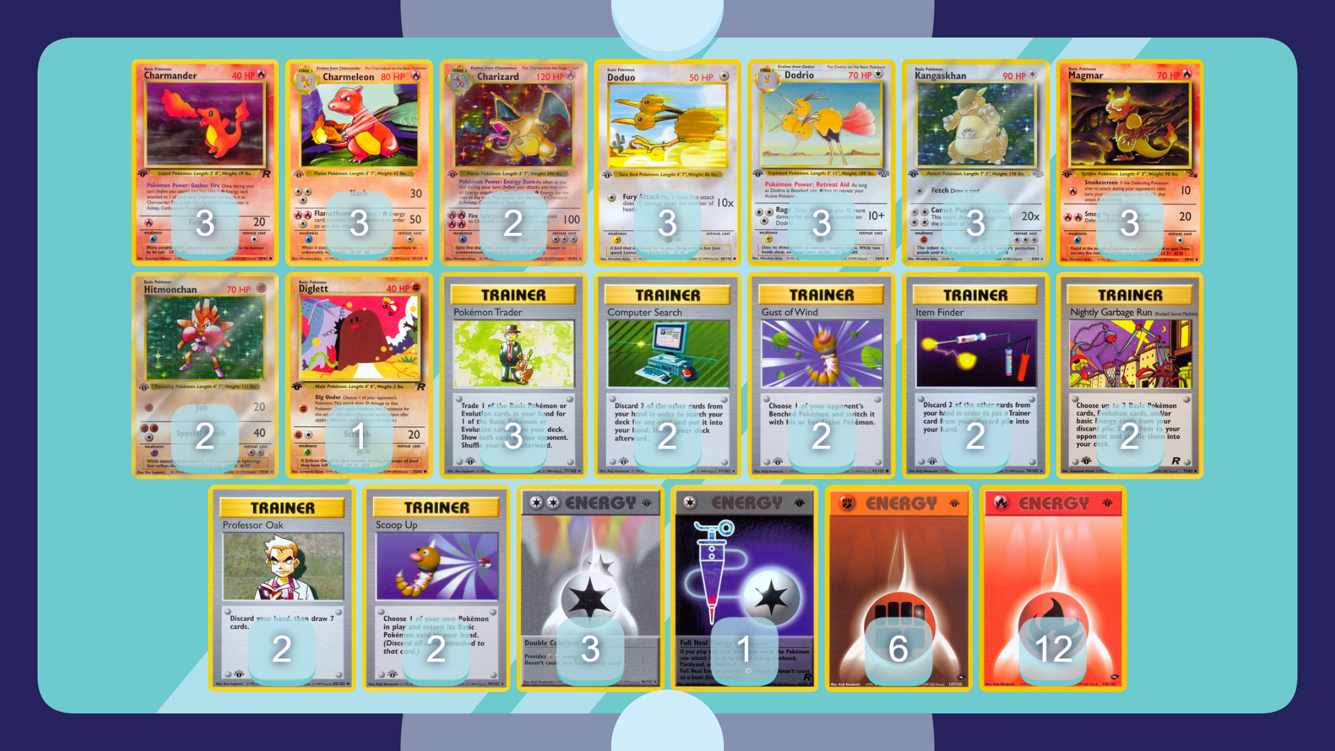 After further testing, Charizard (well, primarily Charmander and Charmeleon) with Dodrio, a slower approach to using Professor Oak, Big Basics and Scoop Ups can convincingly compete against Lightning Dodrio decks (including varieties with Fighting or Evolutions, though Hitmonchan can do some serious damage). The deck’s lineup of lean attackers (Hitmonchan, Magmar, Charmander and Dodrio) with the Gather Fire into Charmeleon possibilities also make it competitive against Slowpoke Lock.