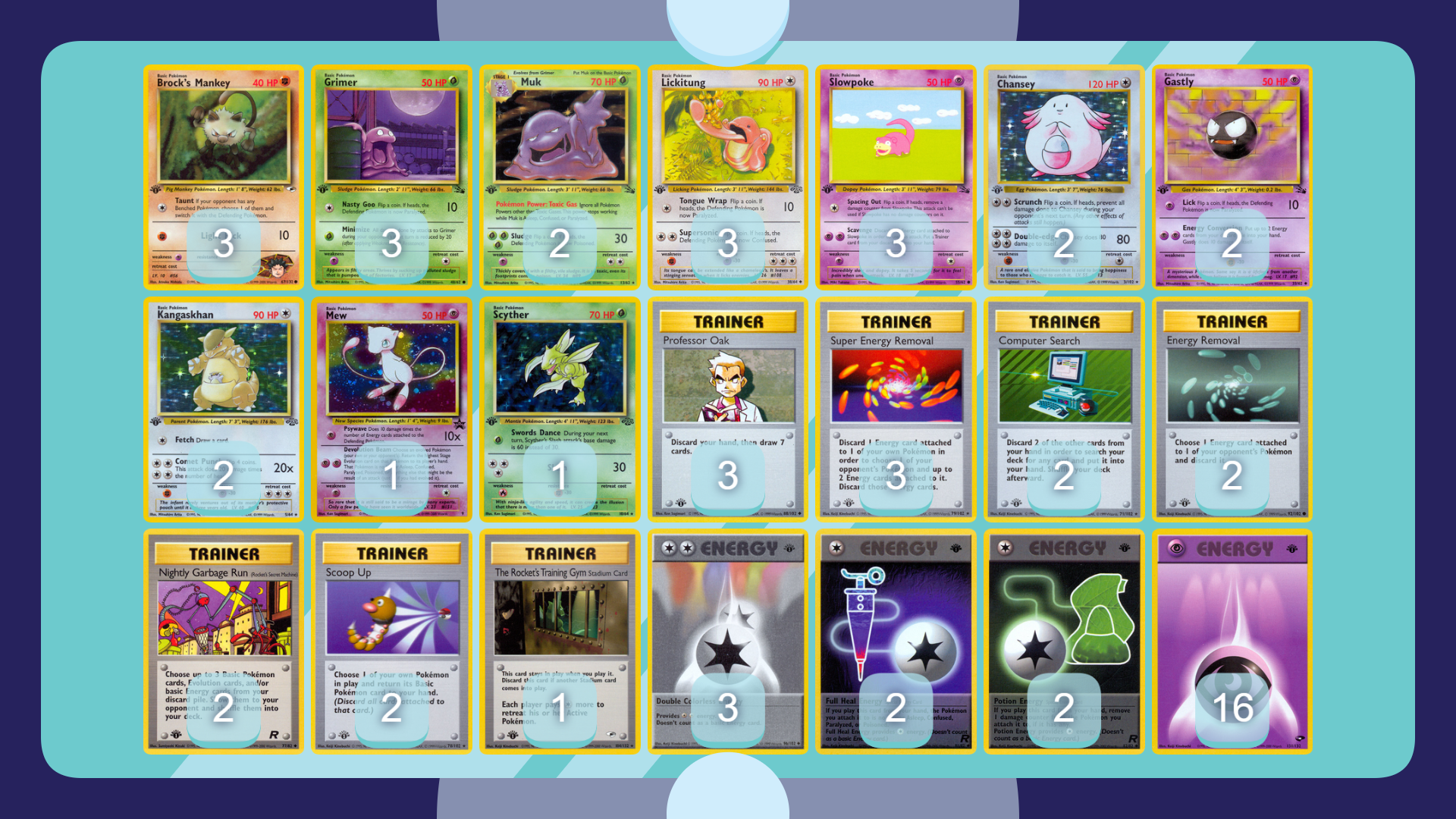 This deck is to be tested further with Kangaskhan, though another version fared well against Lightning Dodrio variants. Koga’s Beedrill can take out many opposing Pokemon while taking little damage itself with some luck. Grimer, Brock’s Zubat and Kangaskhan give the deck some more options to have a good starting Pokemon. With Grimer, the deck has options to evolve into Dark Muk or Muk when they provide advantage.