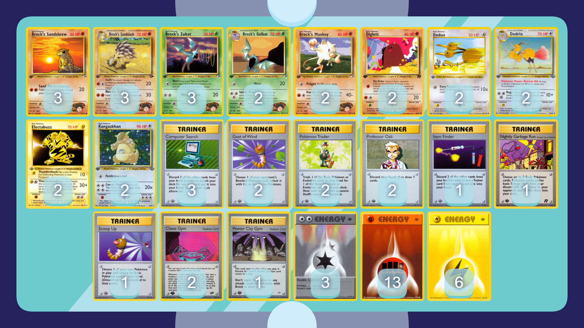 Brock’s Fighting Pokemon rely on Pewter City Gym to surpass Resistances in most matchups, so the deck can have trouble when the Gym is not found early, but this version of the deck relies on Sandslash’s Swift attack, Brock’s Bats, Diglett and Electabuzz to attack Fighting-Resistant Mon. (It doesn’t even play Hitmonchan as to not be as weak to Fighting Resistance!) Brock’s Protection is replaced by the Prop 15/3 terror Chaos Gym; between Zubat and Kangaskhan, this deck looks to overpower other decks in a no-Trainer game state. Lastly, it can temporarily replace its own Chaos Gym with Pewter City Gym in the later game for a truly unfair-feeling (for the opponent) situation!