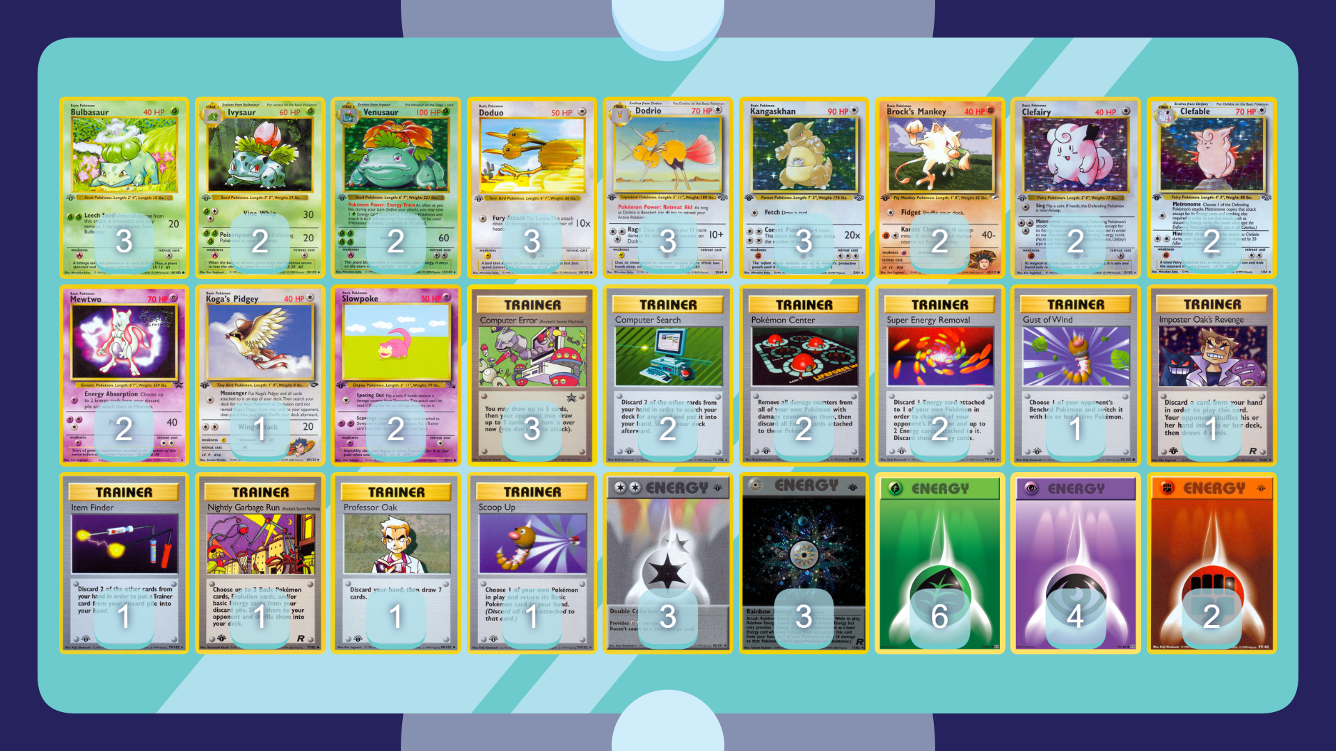 - Power Level – Strong – Venusaur, low-cost retreating and Pokemon Center is a strong combination against any deck that is looking to take 6 prizes and cannot easily OHKO. Brock’s Mankey, Mewtwo and Clefable can OHKO commonly played Pokemon from opponents.