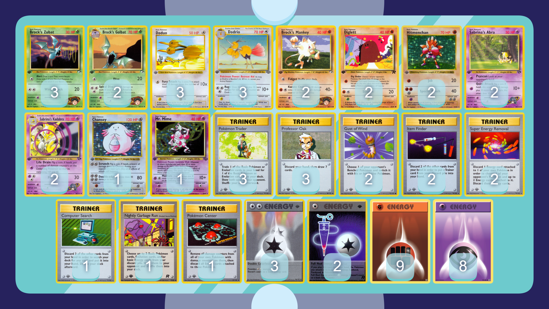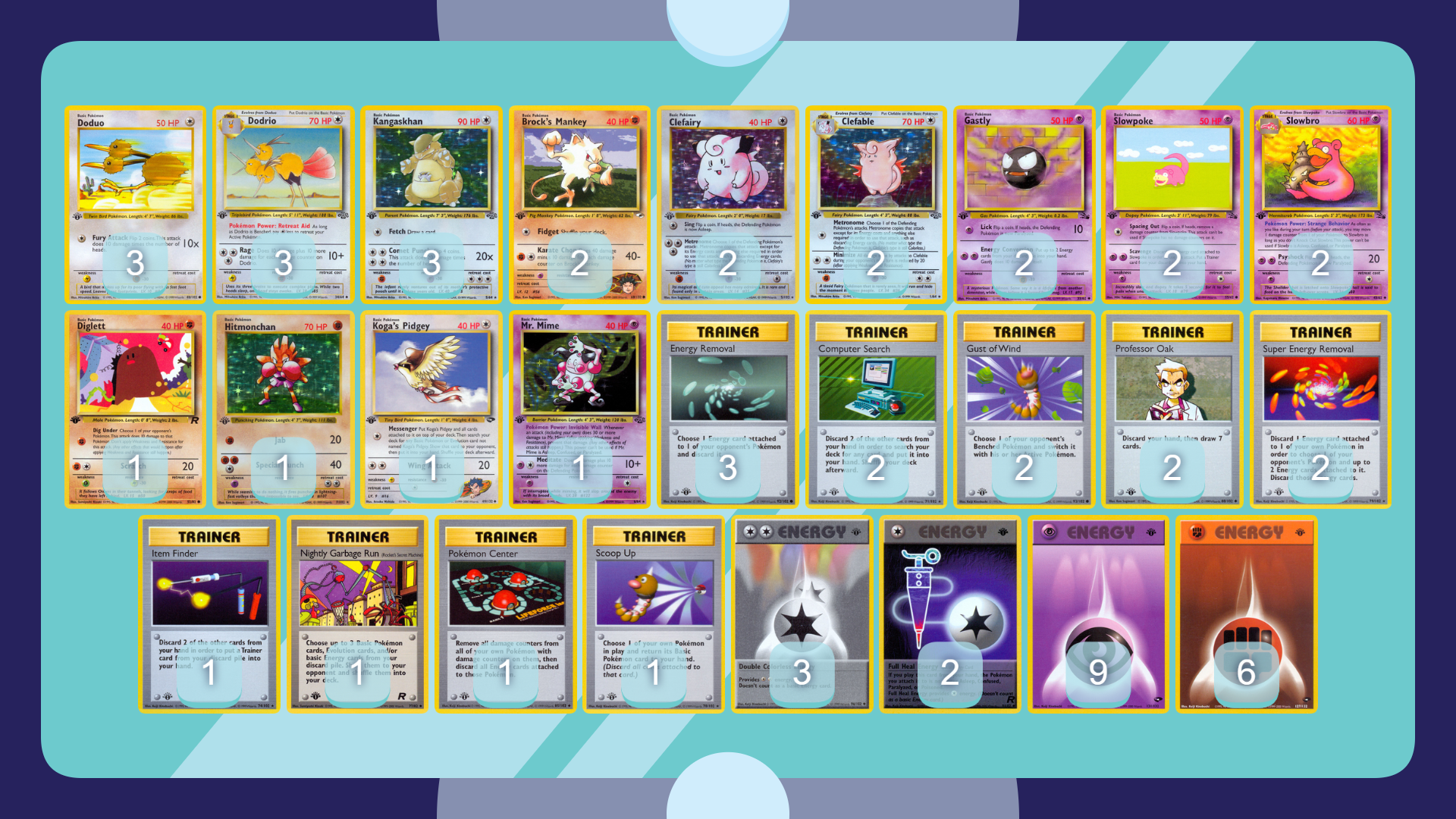 Decks must both be able to disrupt lock decks (Psychic Slowpoke / Brock’s Mankey / Slowpoke Lock) and withstand aggressive decks with the best attackers (Lightning-Fighting Dodrio Wigglytuff) in the game to be competitive. The tricky part is many lock/stall decks play high-damage-dealing Pokemon and aggressive decks may play Pokemon or Trainers to stall out the game while they setup to win. Counterplay to commonly played strong cards will go a long way toward winning games, and access to a single card in a matchup may be the difference between winning and losing (see my introduction to deck-building in 15/3 for more information on commonly played cards and their potential counters)!