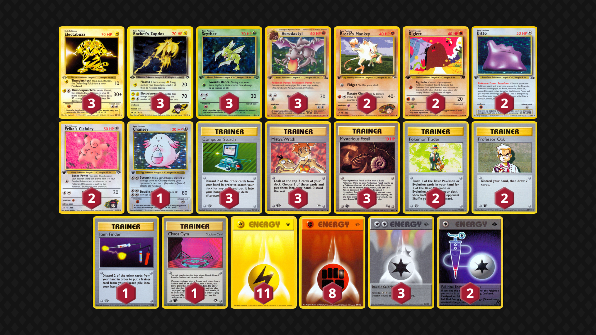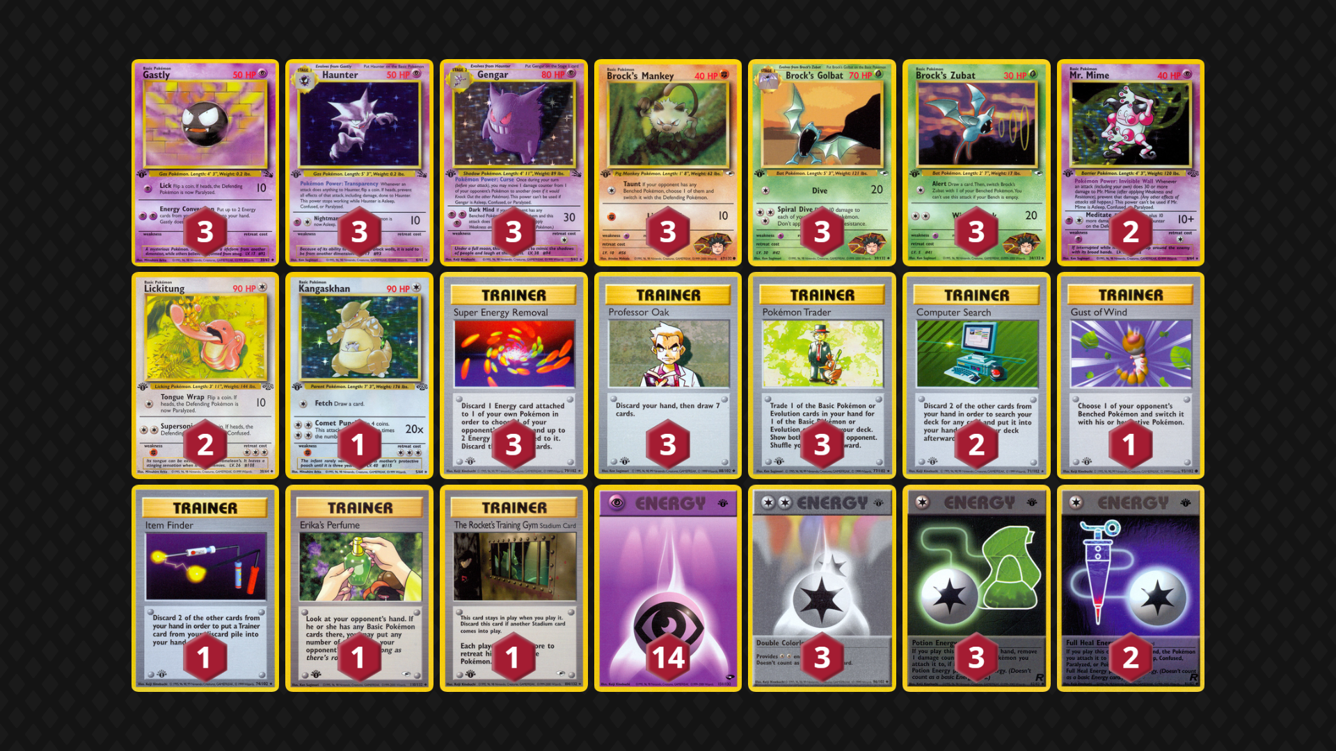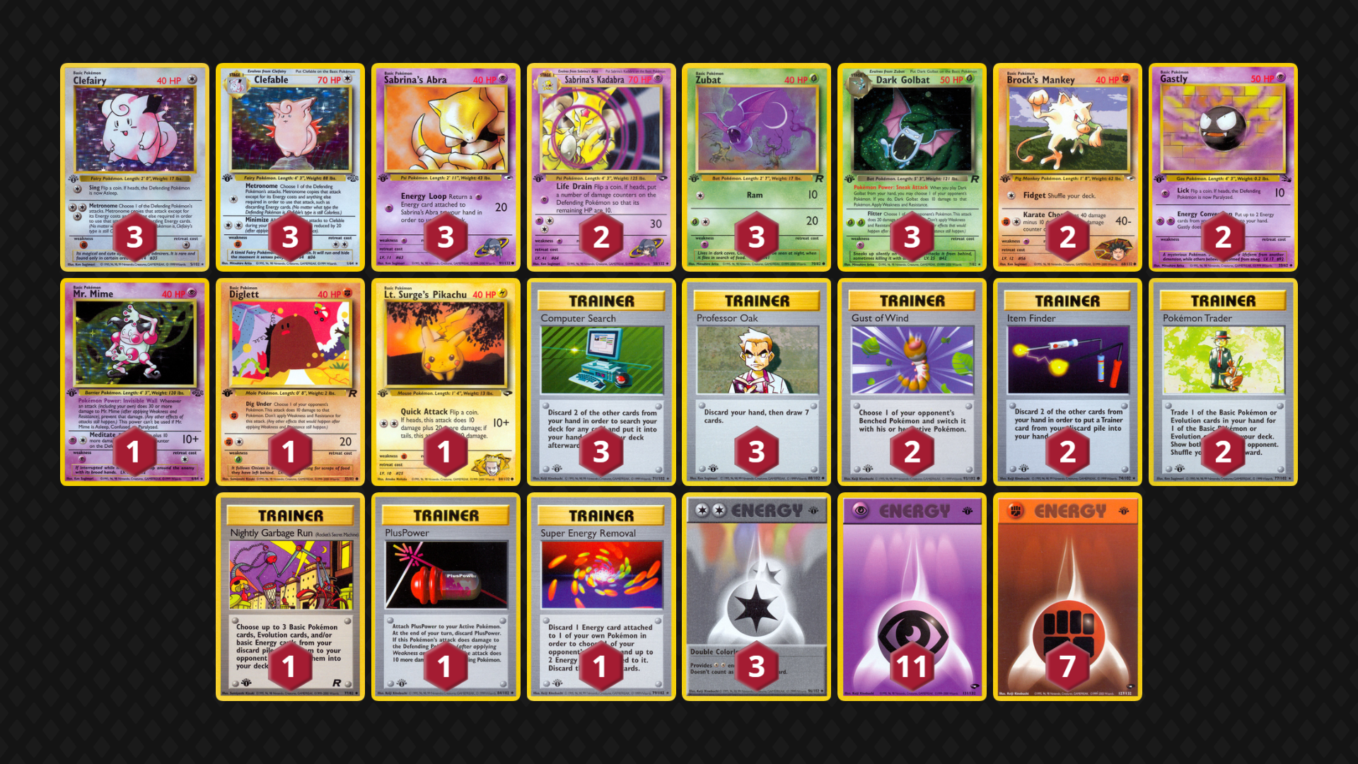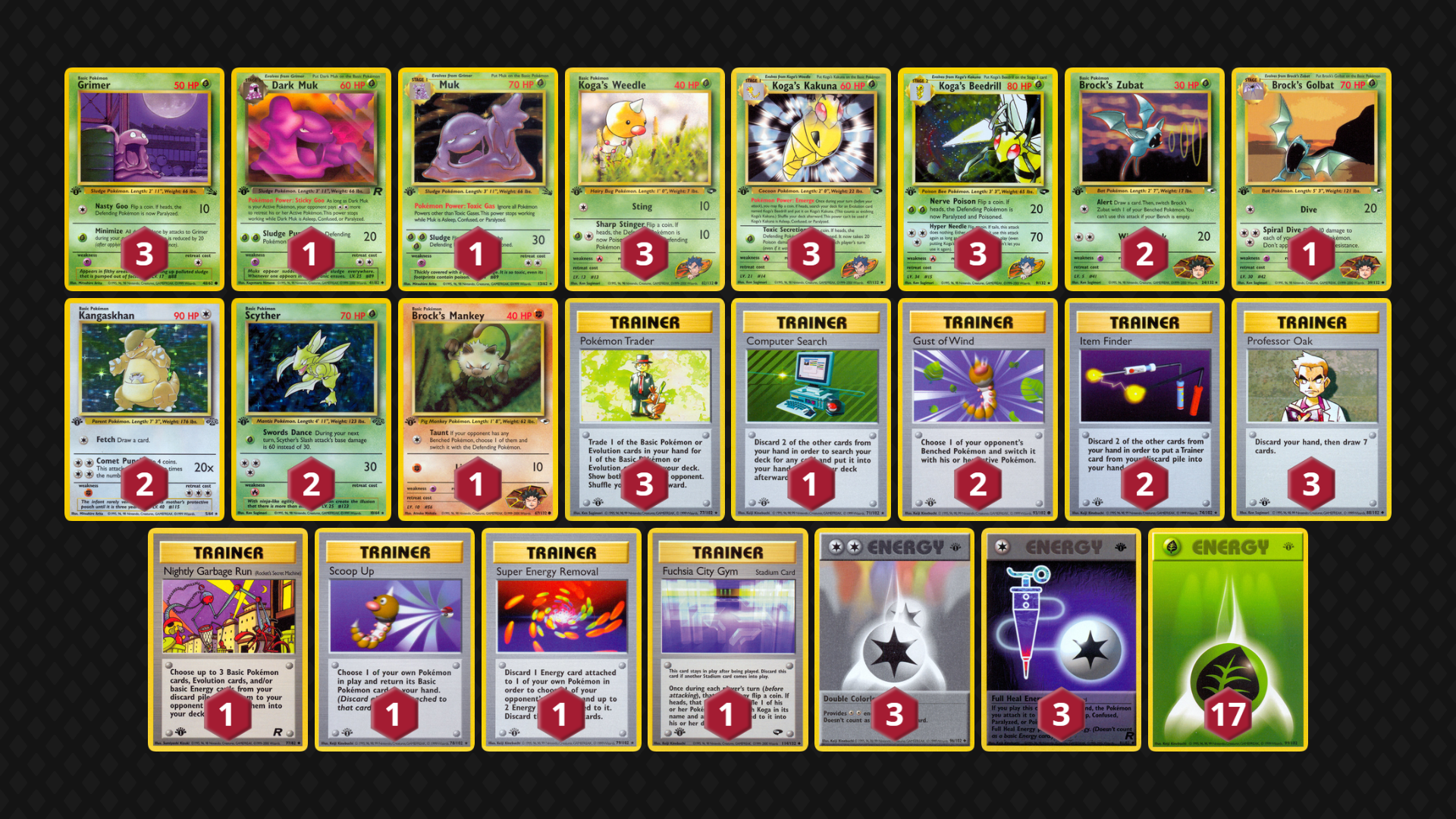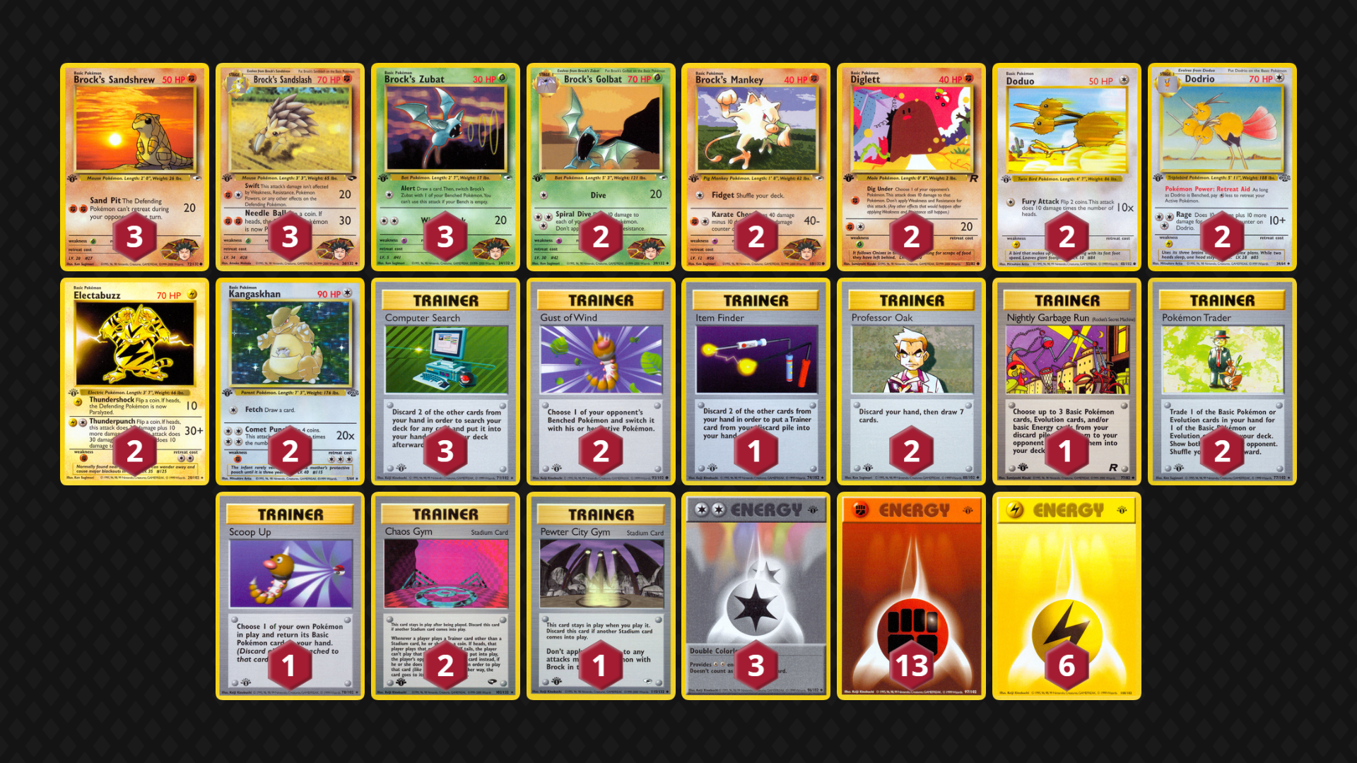 Brock’s Fighting Pokemon rely on Pewter City Gym to surpass Resistances in most matchups, so the deck can have trouble when the Gym is not found early, but this version of the deck relies on Sandslash’s Swift attack, Brock’s Bats, Diglett and Electabuzz to attack Fighting-Resistant Mon. (It doesn’t even play Hitmonchan as to not be as weak to Fighting Resistance!) Brock’s Protection is replaced by the Prop 15/3 terror Chaos Gym; between Zubat and Kangaskhan, this deck looks to overpower other decks in a no-Trainer game state. Lastly, it can temporarily replace its own Chaos Gym with Pewter City Gym in the later game for a truly unfair-feeling (for the opponent) situation!
