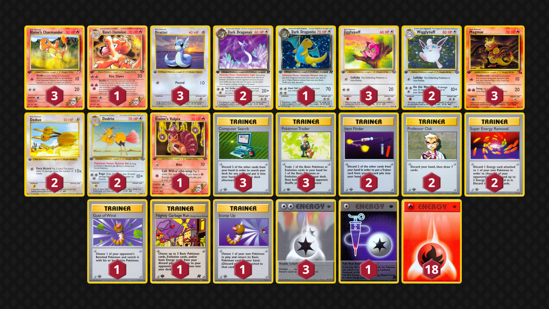 This deck was built after testing Jason’s Kindle Lock deck (and wishing I could retreat Blaine’s Charmander for free). Dark Dragons allow the deck to play a toolbox of Mon (with Wigglytuff sitting on top to provide a large source of damage). It needs quite a bit more tuning, but the core strategy (Dark Dragon, Dodrio, Blaine’s Charmander) seems promising.