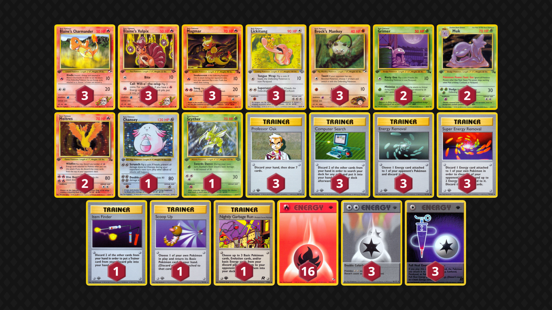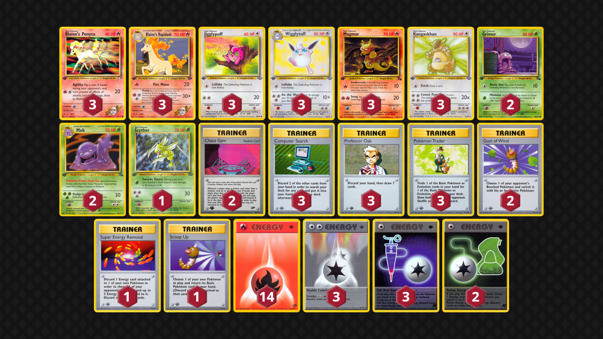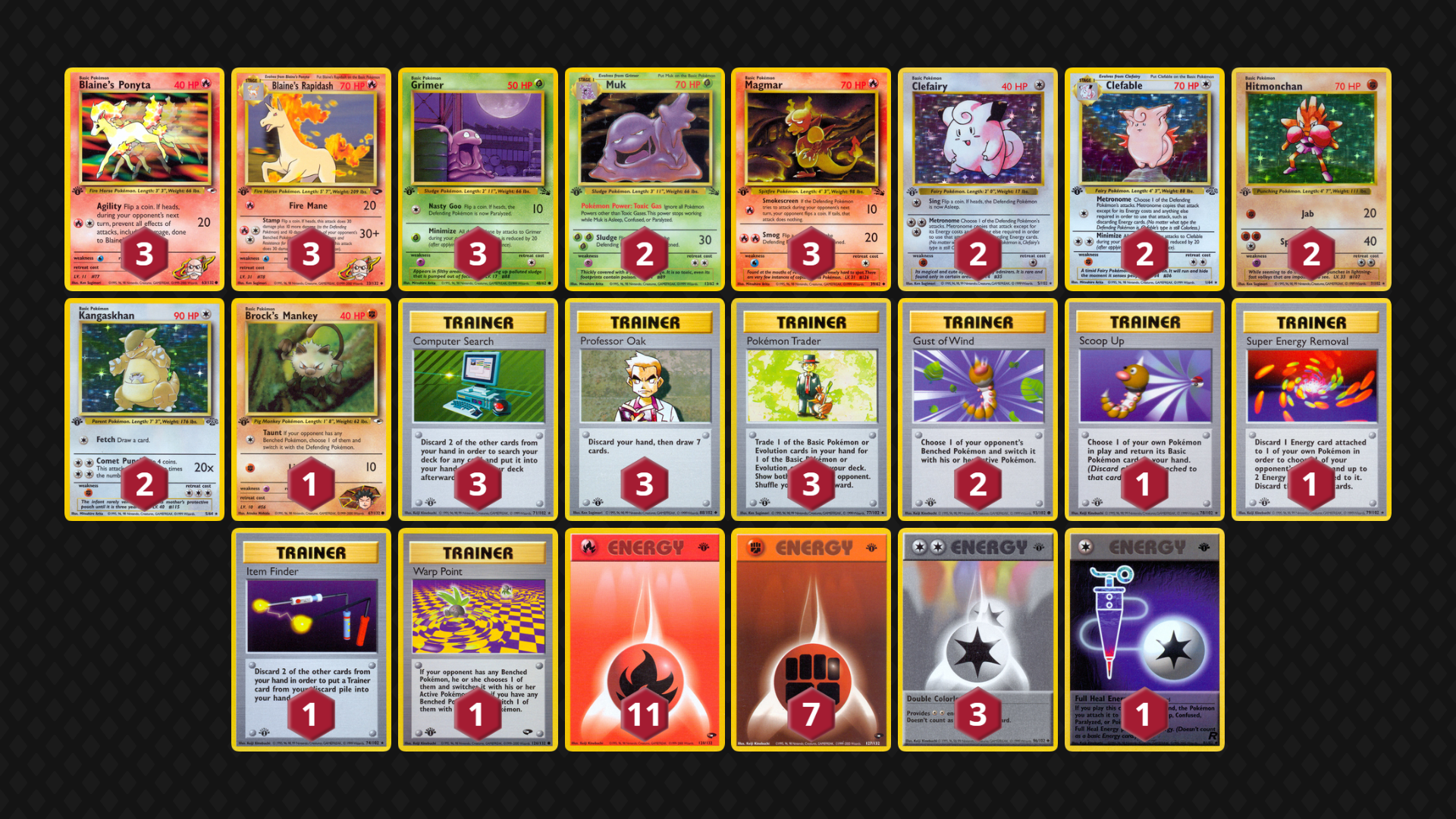 Originally designed as a counter to Fire Blaine’s Rapidash / Wigglytuff / Muk, this deck hits hard when the flips are in its favor: Super Removal success being a very strong attack. There are a lot of options for Energy, Trainers and Basics, but this list looks to run the opponent out of Energy cards if.