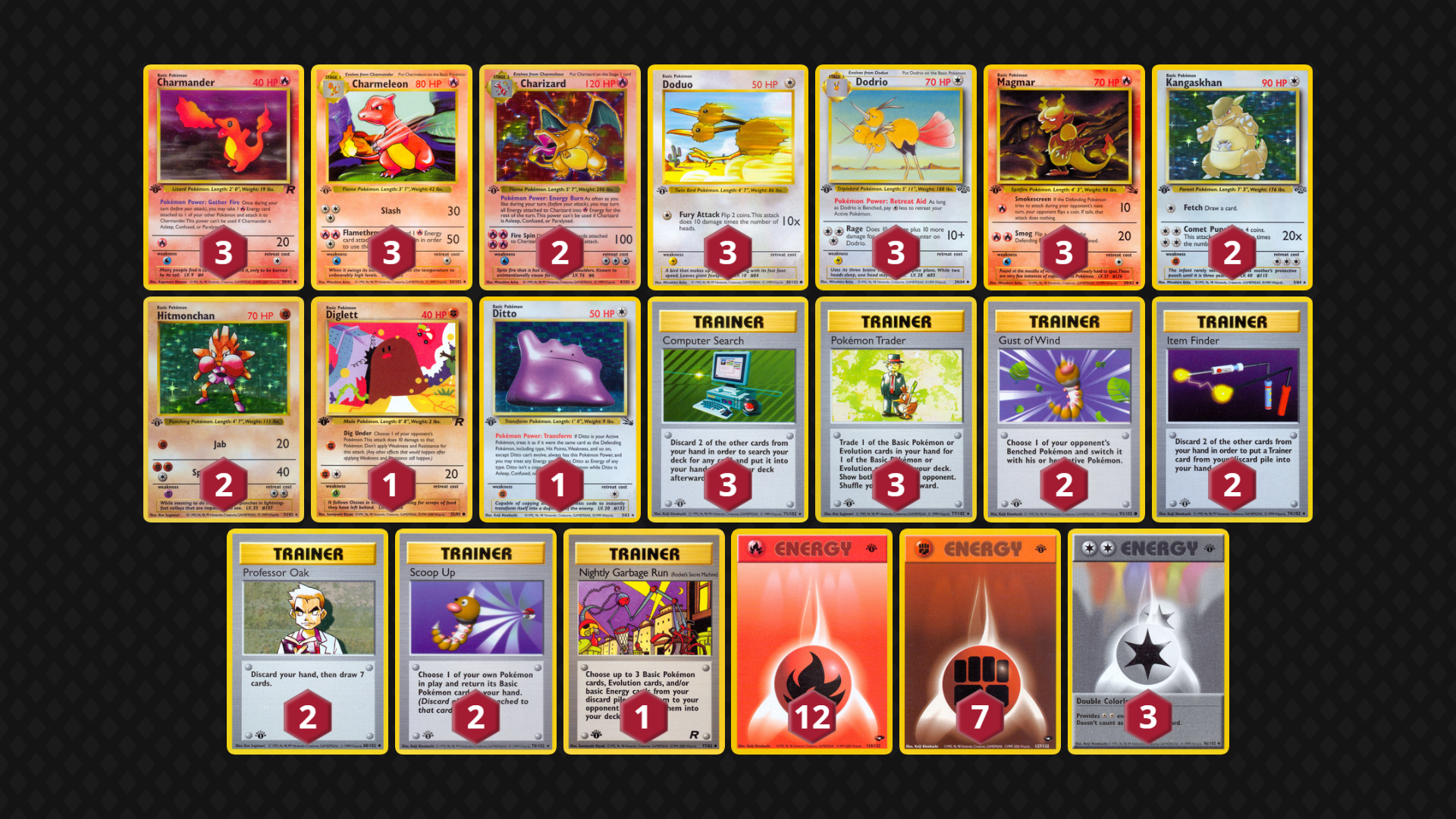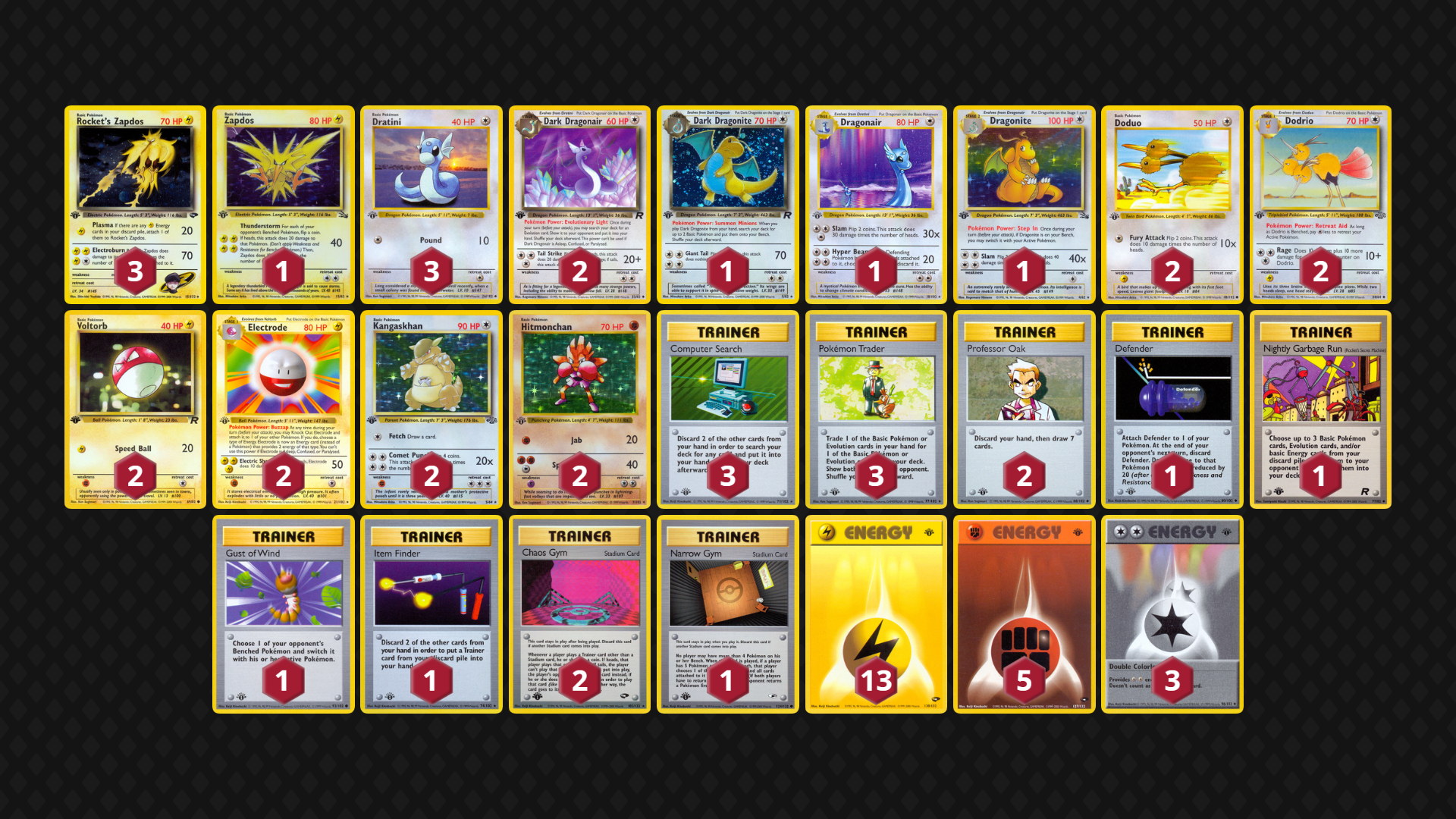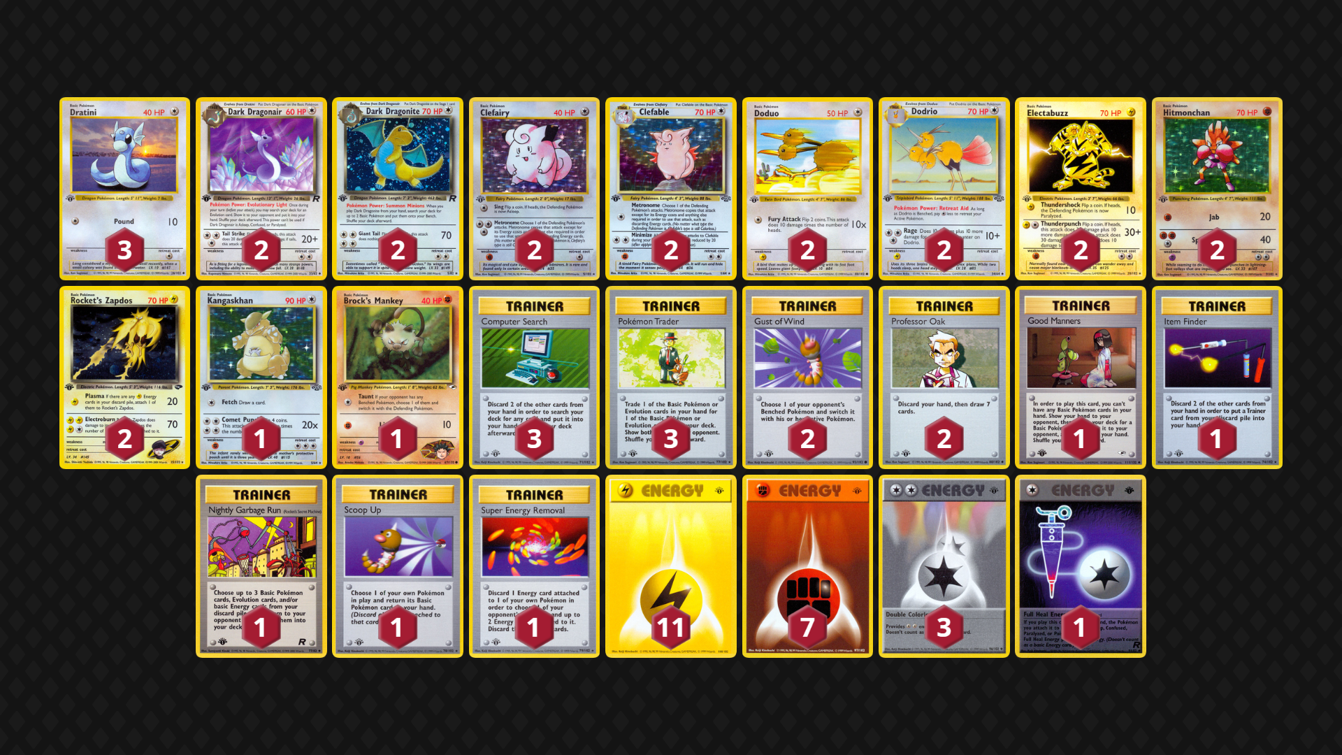 - Power Level – Strong – Rocket’s Zapdos, Clefable, Hitmonchan and Brock’s Mankey can do massive amounts of damage with only one or two Energy cards from hand. Dodrio and Dragonite give the deck extra flexibility to switch between attackers.
