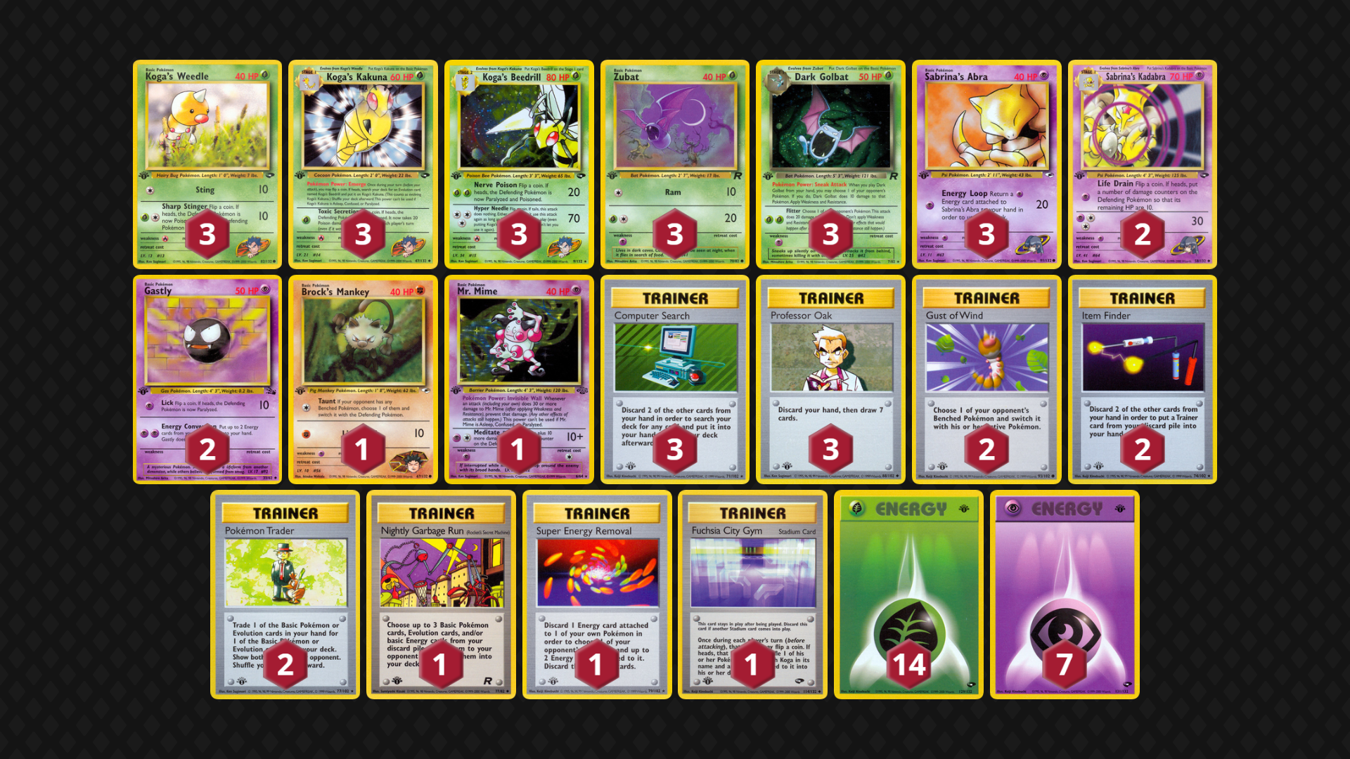 Dark Golbat’s stats are a bit underwhelming in this shell. And Sabrina’s Kadabra’s reliance on coin flips pairs poorly with Koga’s Beedrill (which is also relying on flips) to make a very inconsistent performer. I prefer the variants of Koga’s Beedrill above.