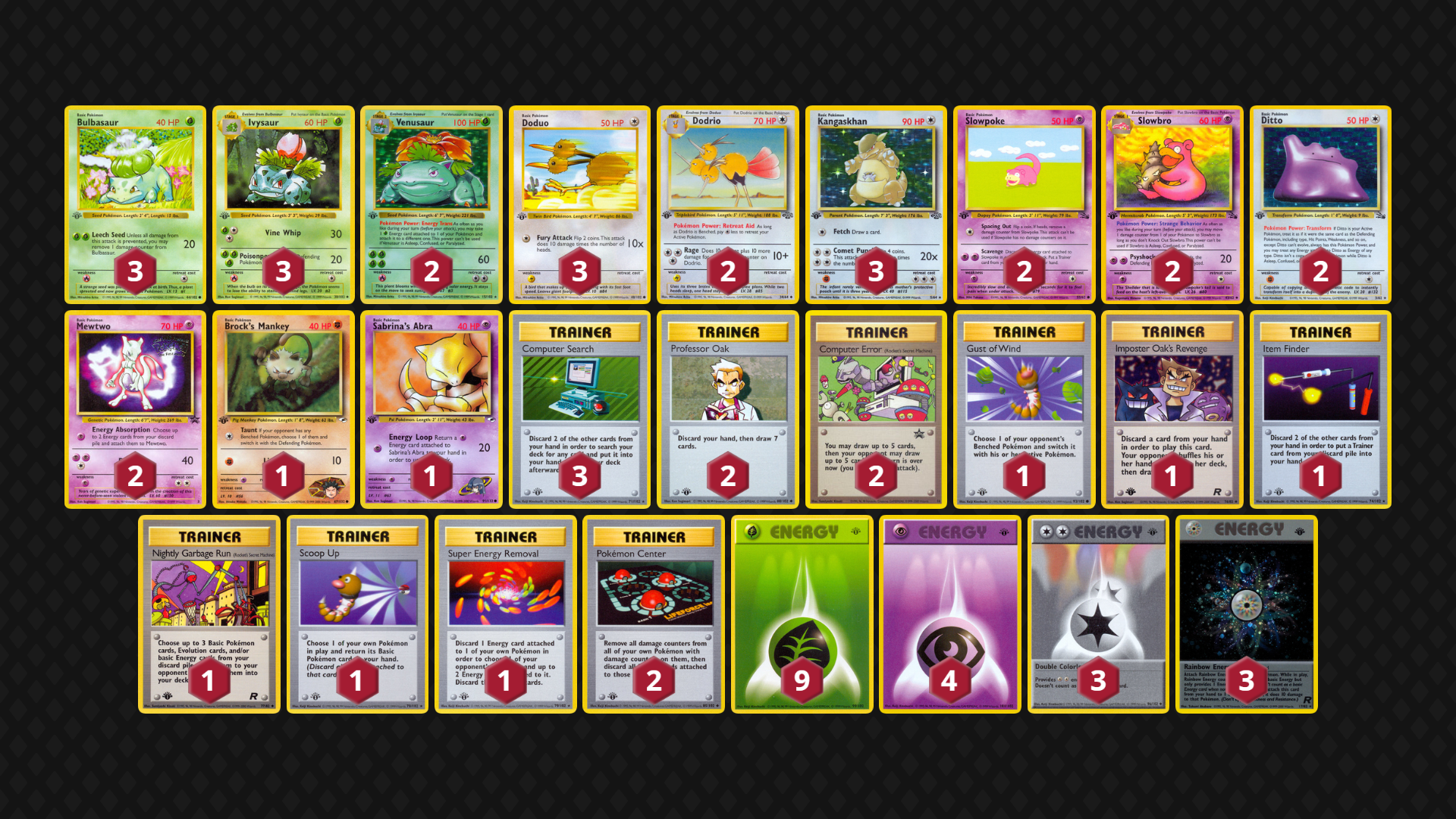 - Power Level – Strong – Venusaur, low-cost retreating and Pokemon Center is a strong combination against any deck that is looking to take 6 prizes and cannot easily OHKO. Brock’s Mankey, Mewtwo and Clefable can OHKO commonly played Pokemon from opponents.