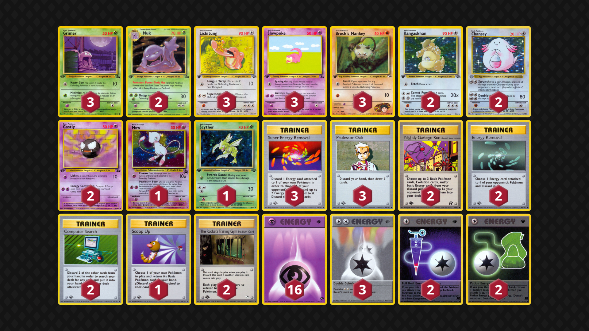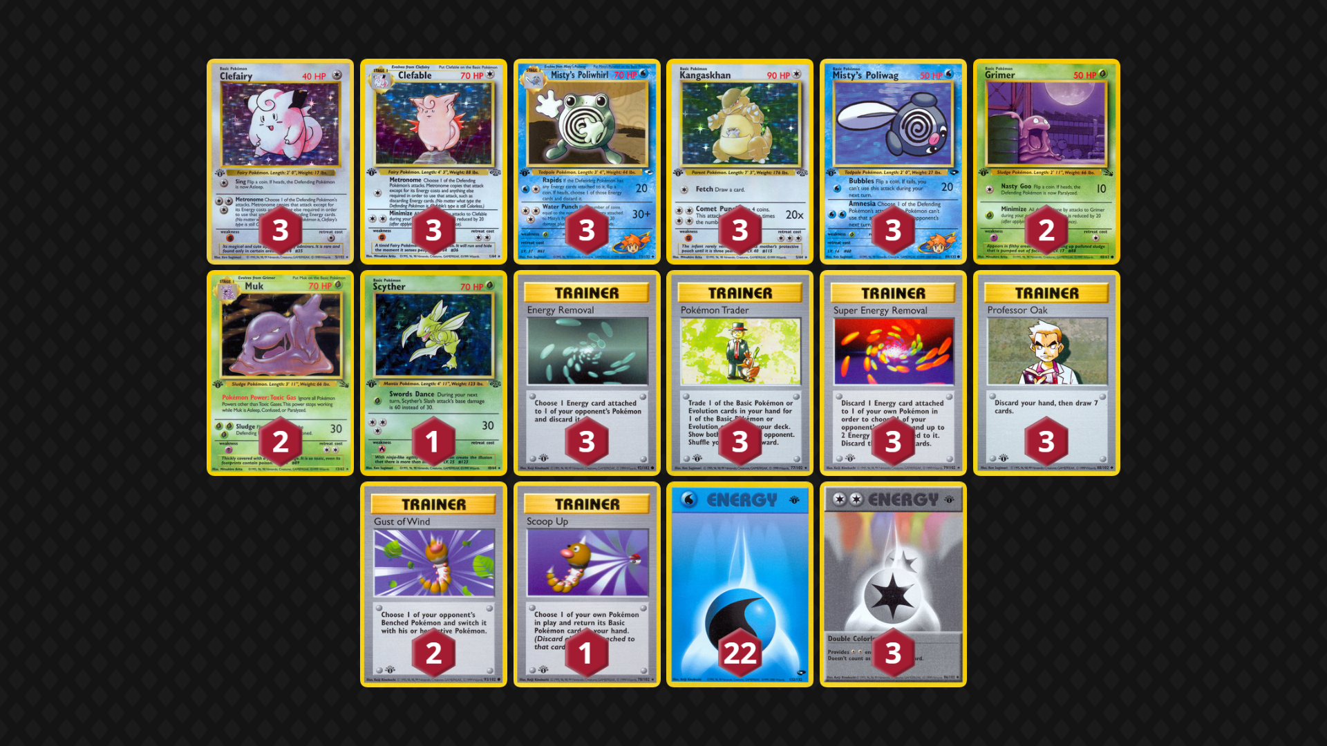 Misty’s Poliwhirl can supplement Energy Removals while Muk turns off Pokemon Powers. Clefable threatens Rocket’s Zapdos. Played to good result in the Mega Battle, I would like to see how this deck develops with more testing.