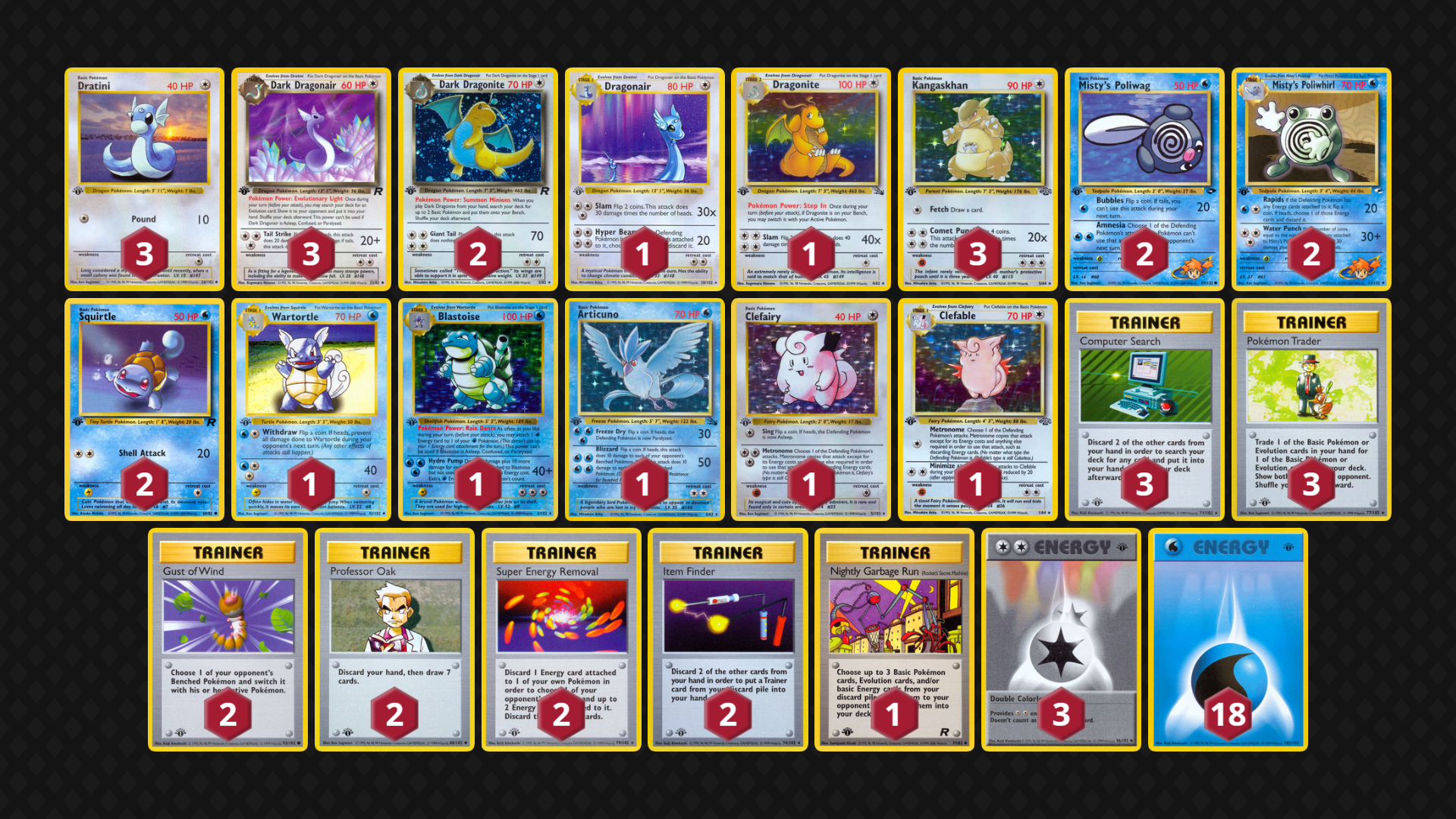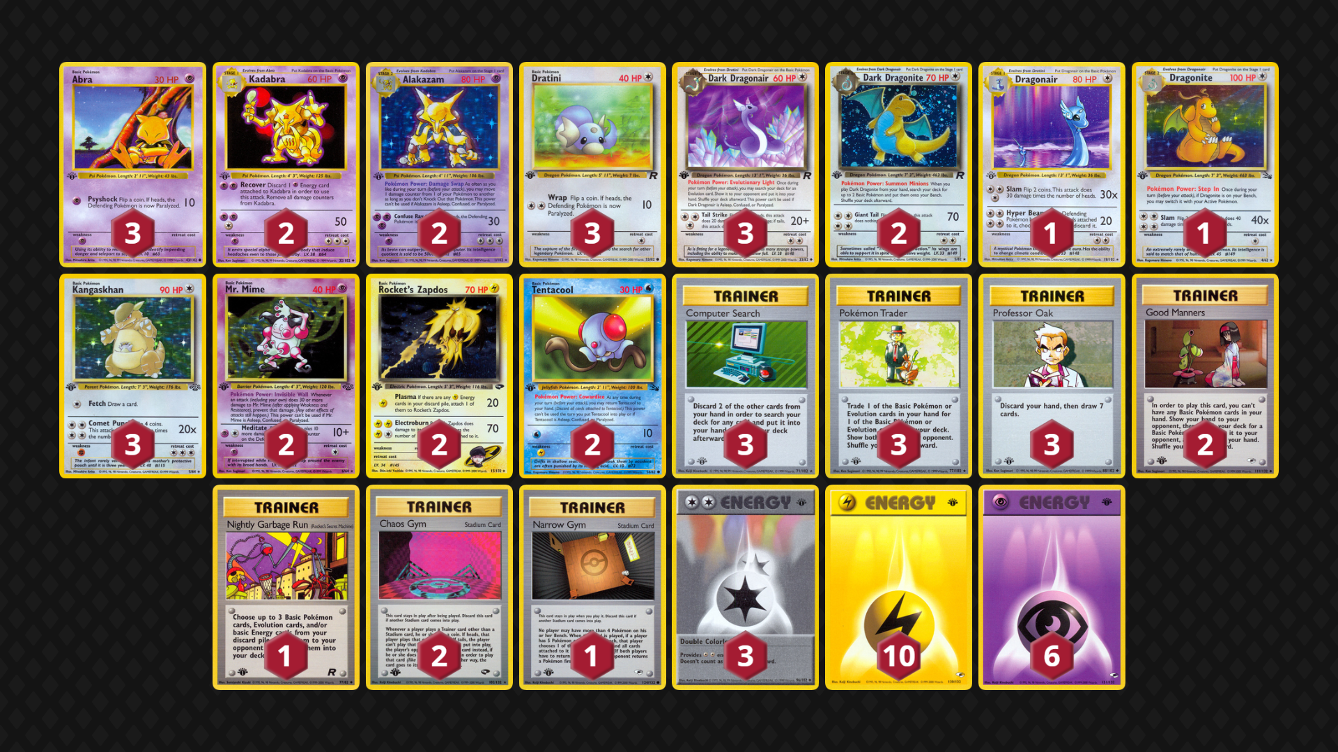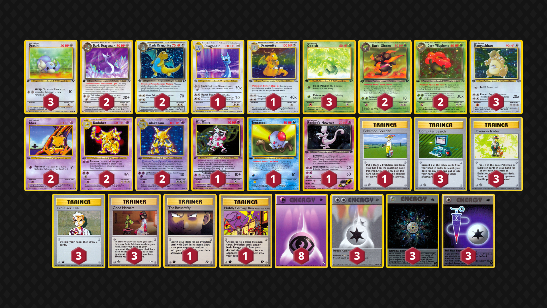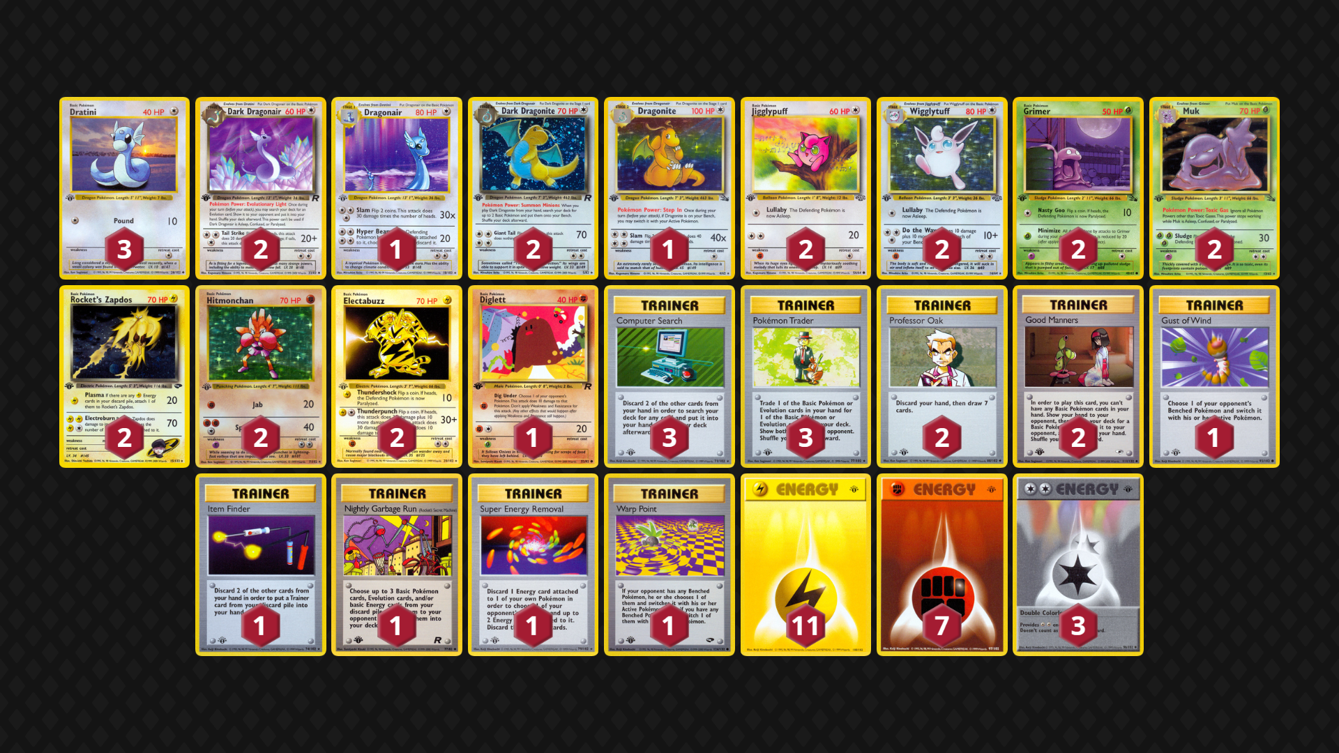 Inspired by an earlier Pokemon 1999 league deck from user jiffy, Dark Dragons supplement both Wigglytuff and Muk Stage 1 lines along with some of the best Big Basics. While recently not tested to great volume, a variant of this deck seems like a natural predator to Alakazam and Dark Vileplume decks.