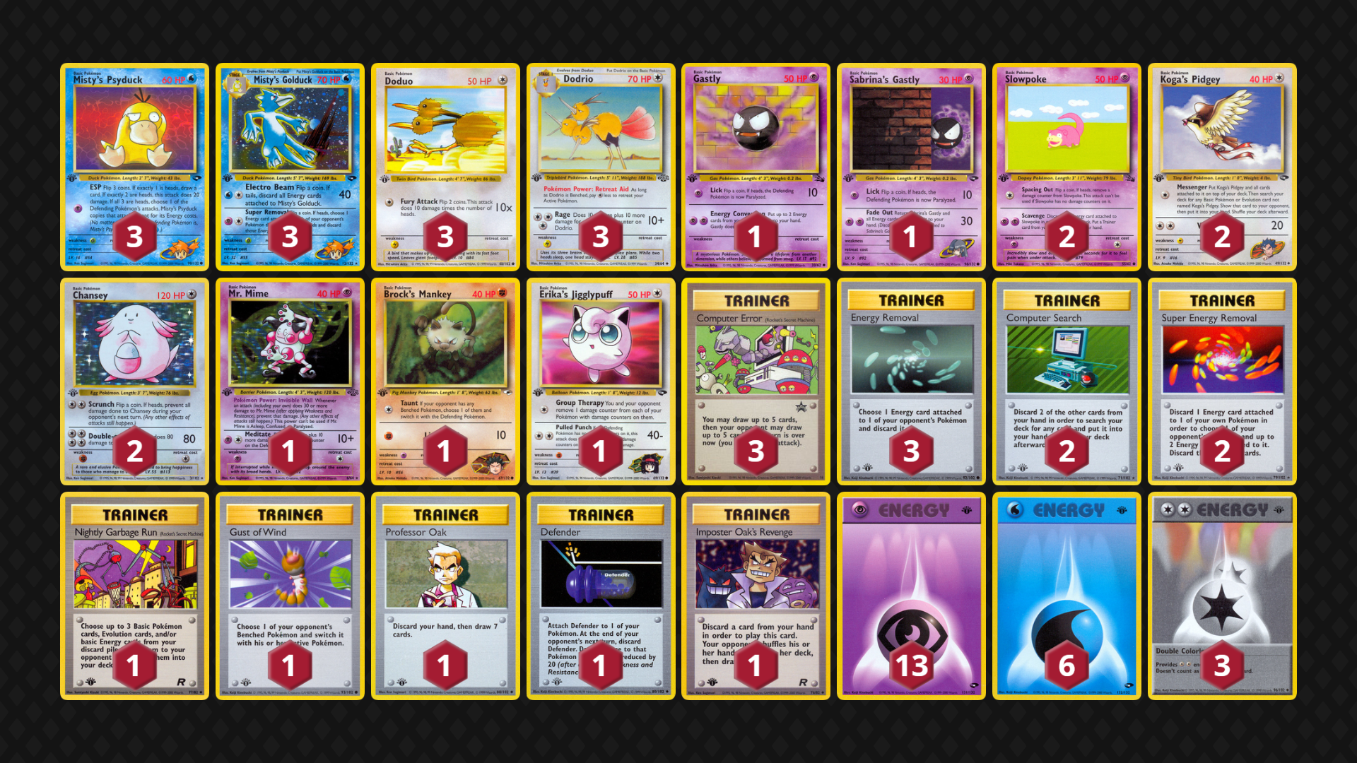 - Consistency (Deck Construction) – Somewhat Consistent – Computer Error, Computer Search and Koga’s Pidgey provide the majority of consistency (with some Misty’s Psyduck flips and a single Professor Oak helping every now and then).