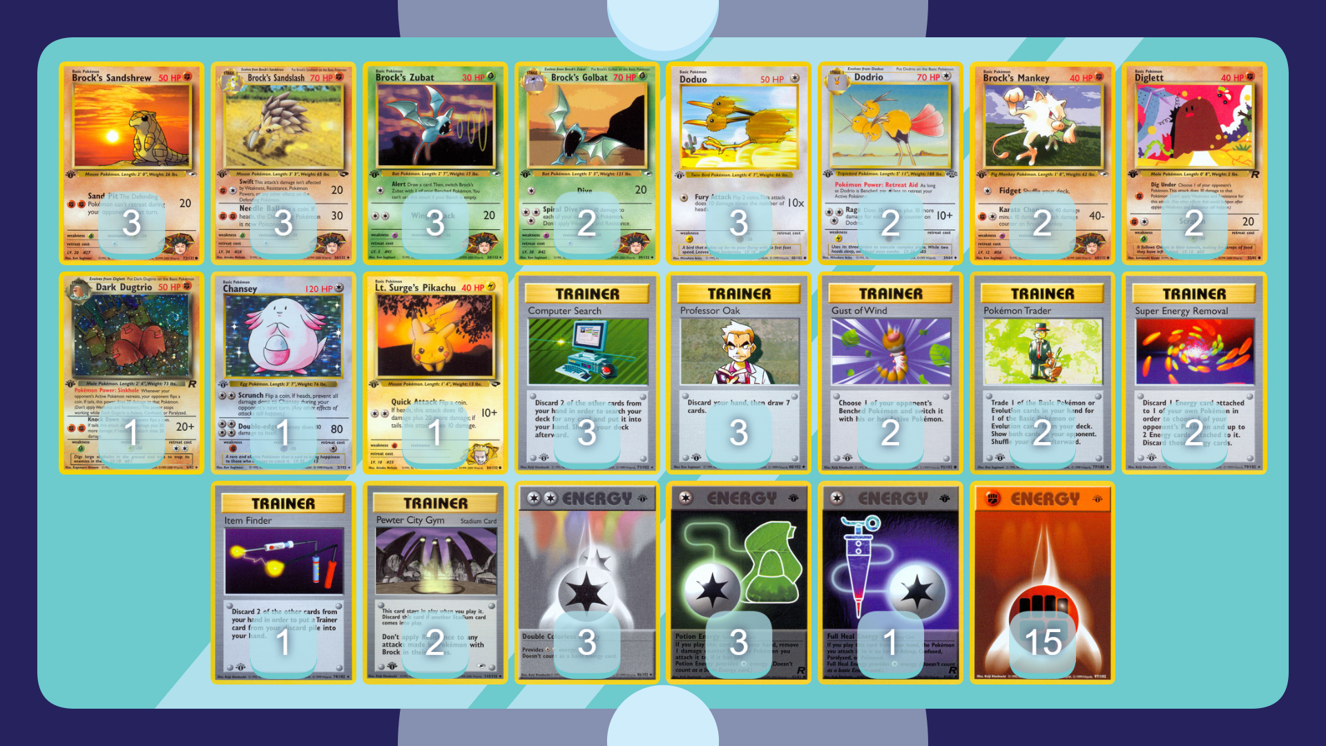 Testing poorly against Slowpoke Lock and Lightning-Fighting Wigglytuff, Brock’s Sandslash is bolstered by a Brock’s Bats, Dodrio and some utility ‘Mon. After trying a 2-2 Sandslash line with Rocket’s Zapdos (and then Electabuzz), I felt the deck inconsistently setup and had Energy type issues; this version plays mostly Fighting Mon (with Brock’s Golbat to answer Fighting Resistance when Pewter City Gym isn’t in play or to contest Grass Pokemon). With so many Fighting-resistant Pokemon, Chaos Gym was removed to focus on sticking Pewter City Gym (and leaning on well-timed Super Energy Removals to support Brock’s attackers).