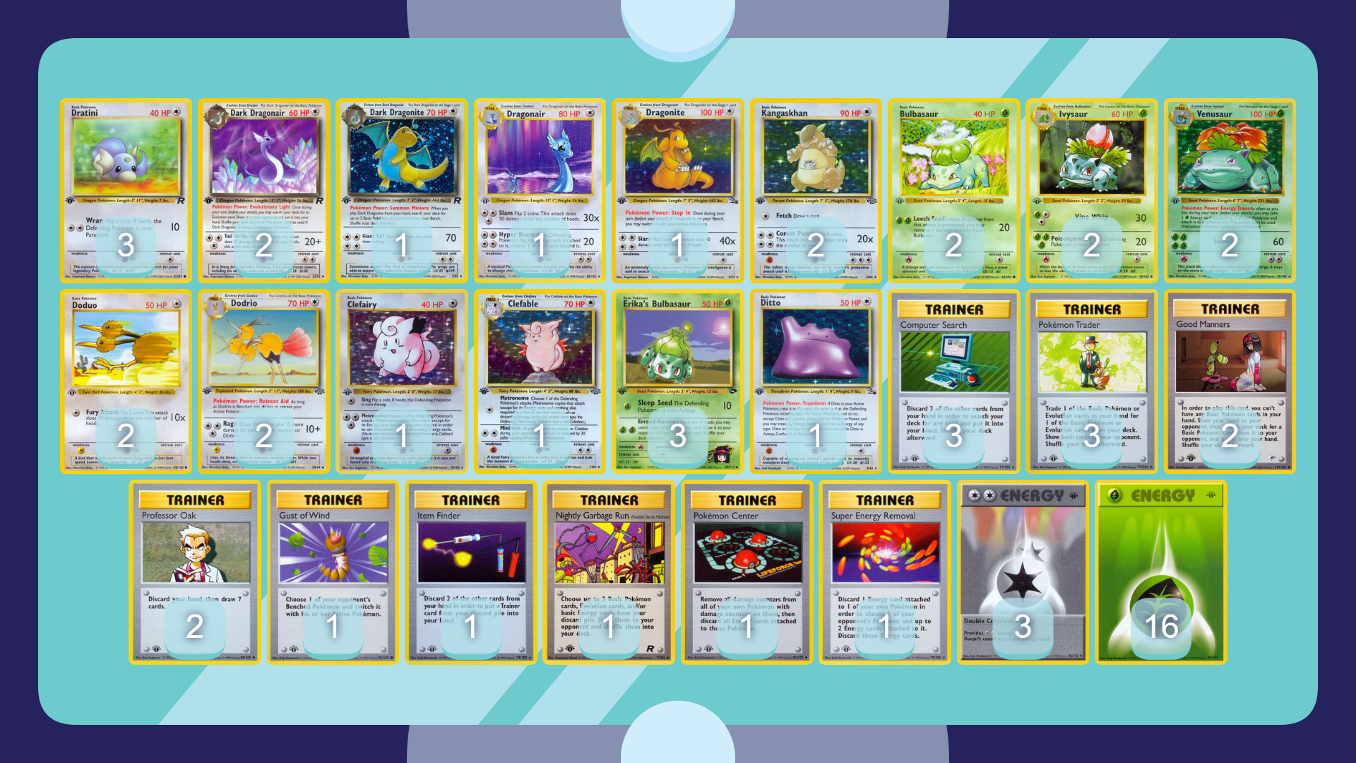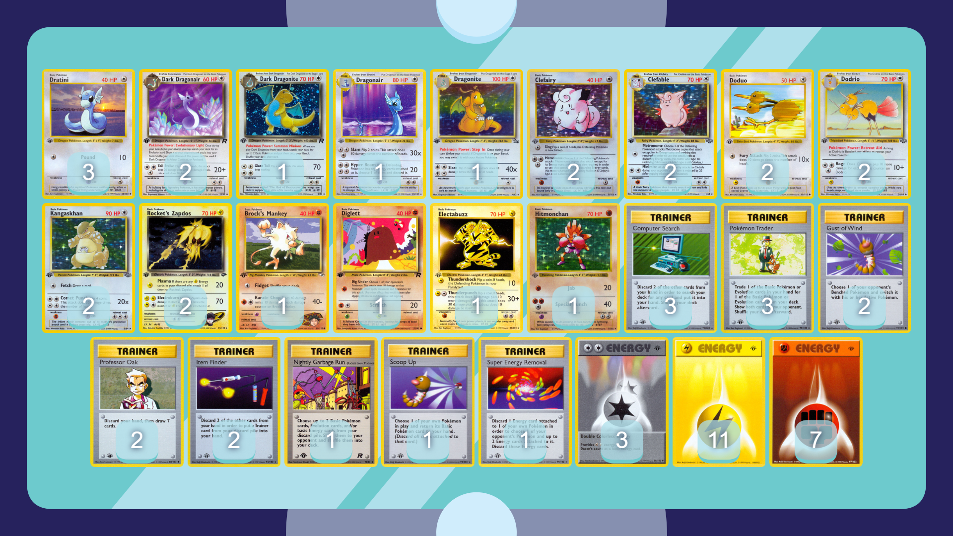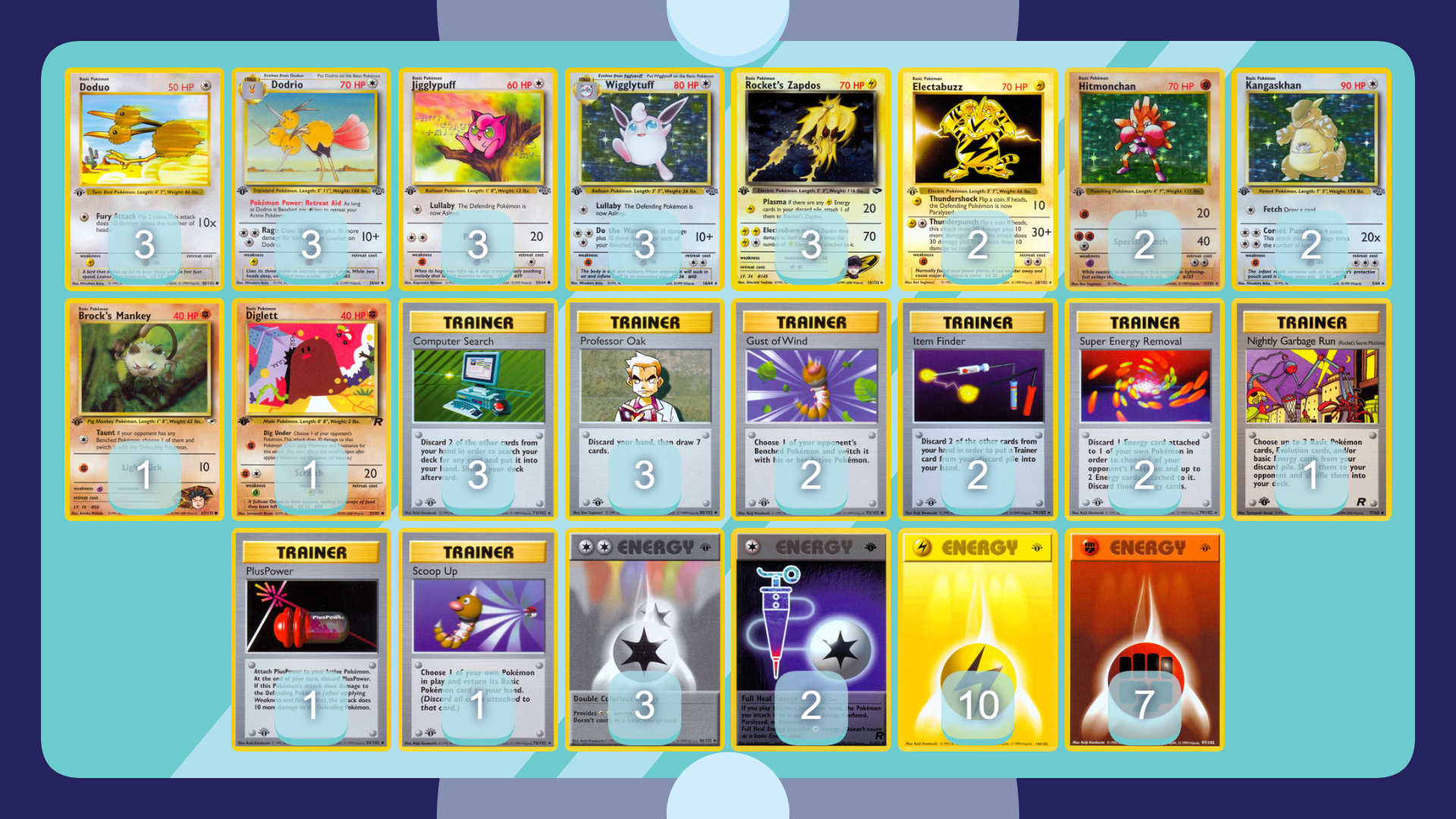 I also maintain a version of the above with a Kangaskhans and Nightly Garbage Run to focus on longer games (and ensure Wigglytuff and Dodrio can be assembled when those longer games occur). Brock’s Mankey (67) and Team Rocket Diglett offer some additional tools versus slower, controlling opponents.