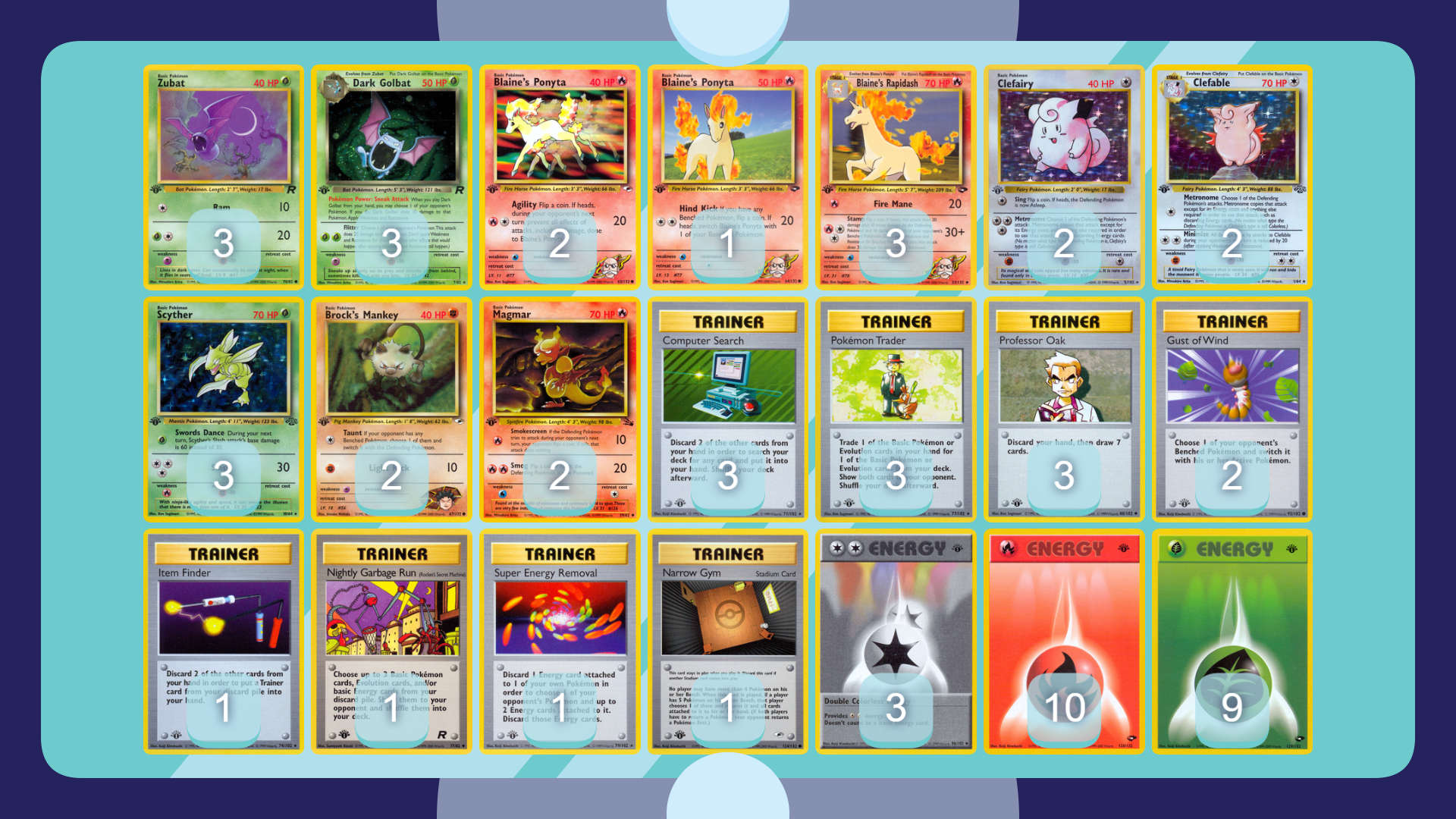 - Grass-Fire Blaine’s Rapidash Dark Golbat Clefable