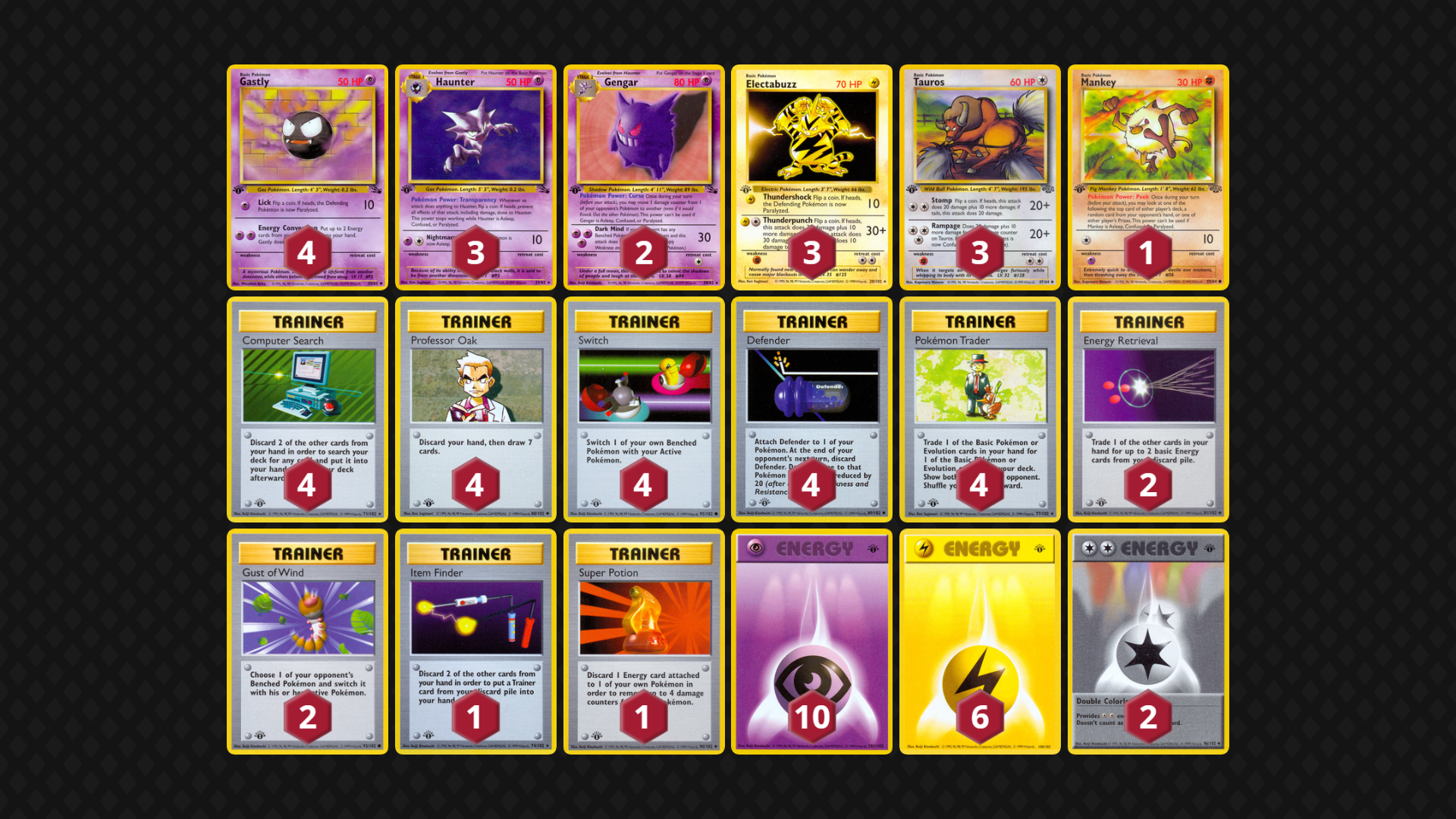 - Only one of each card with the same name allowed in a deck, except for Basic Energy. For example, a deck can only have one Gyarados, but it may also have a Dark Gyarados, Misty’s Gyarados and Giovanni’s Gyarados!
