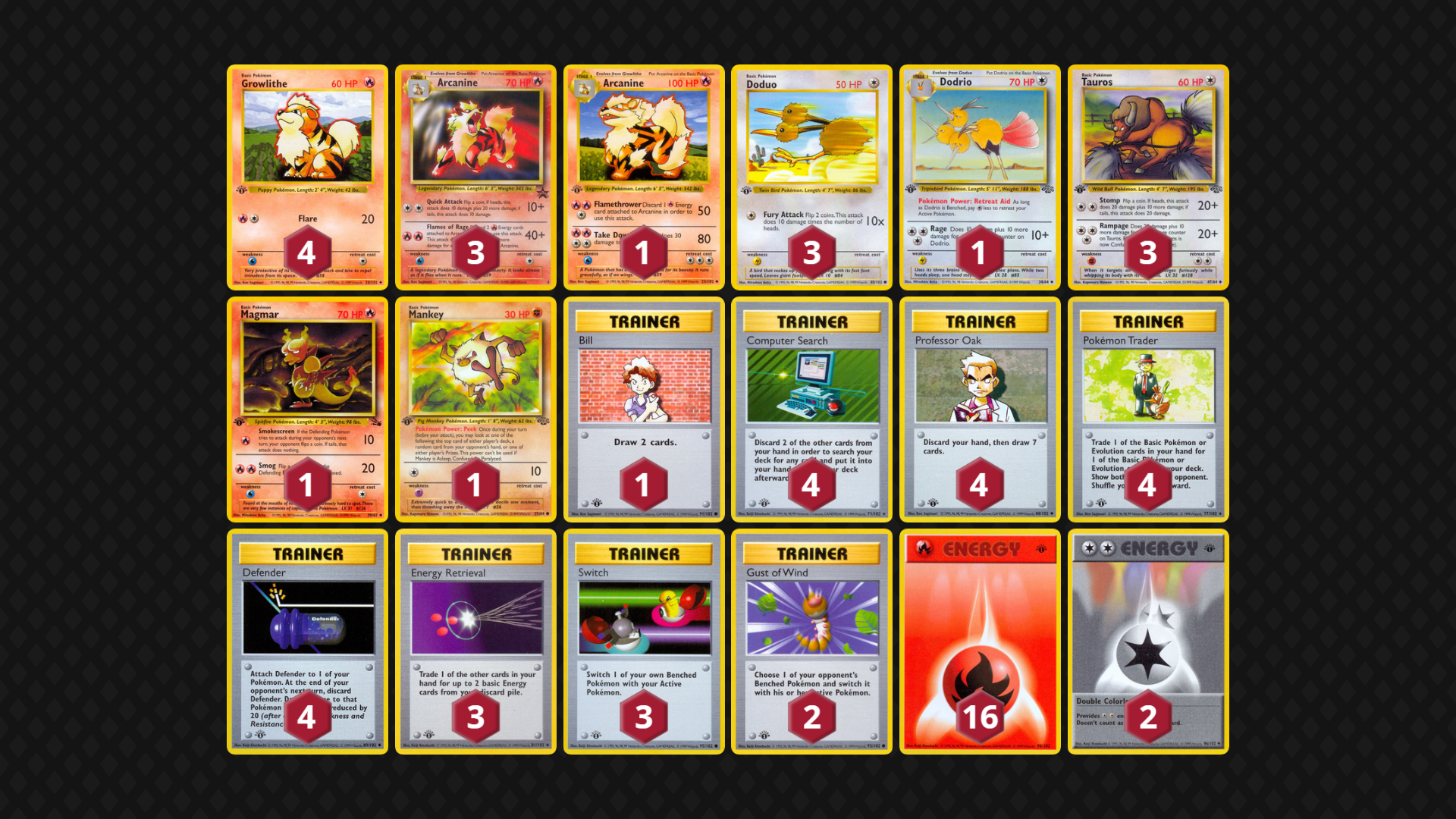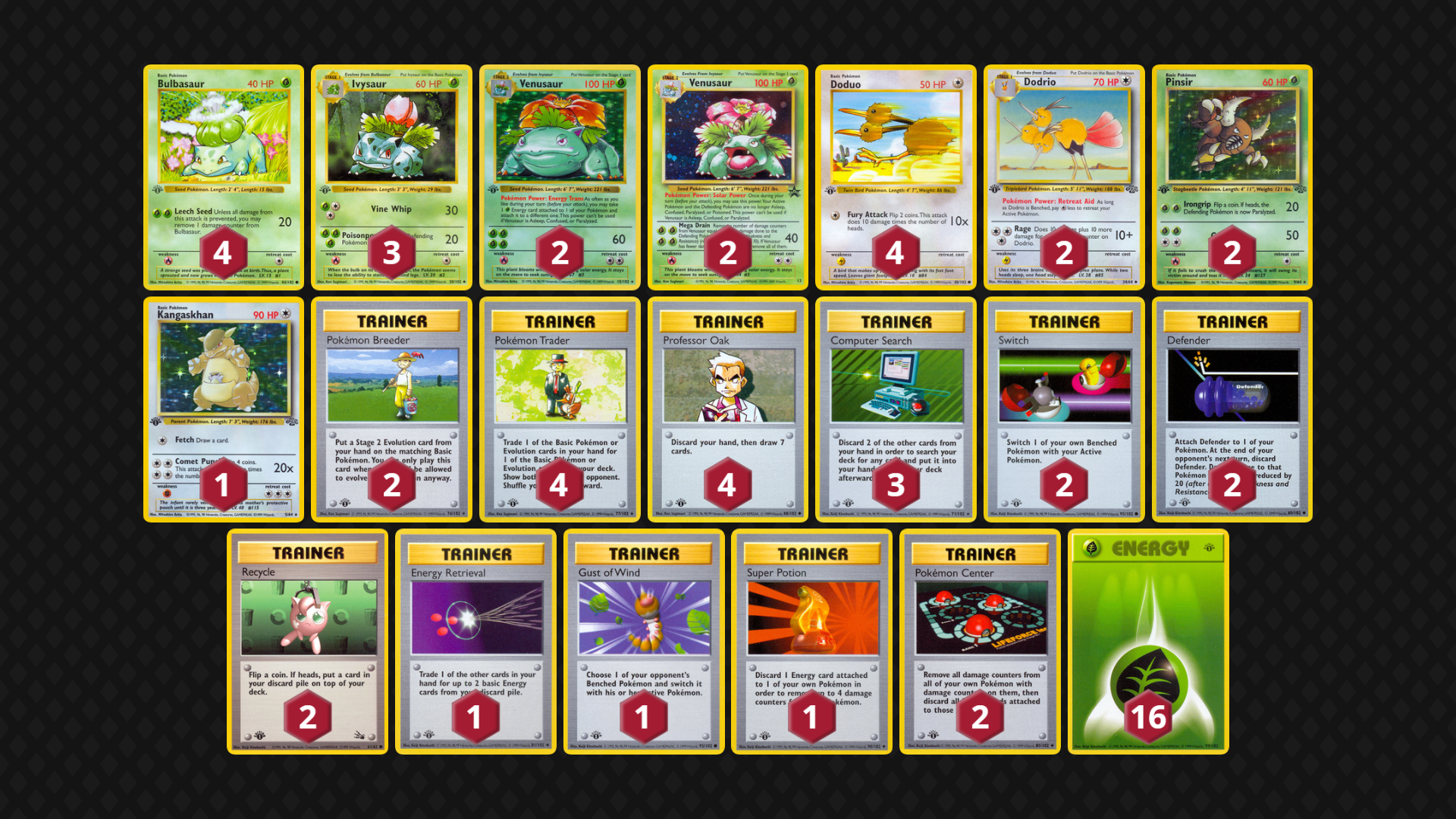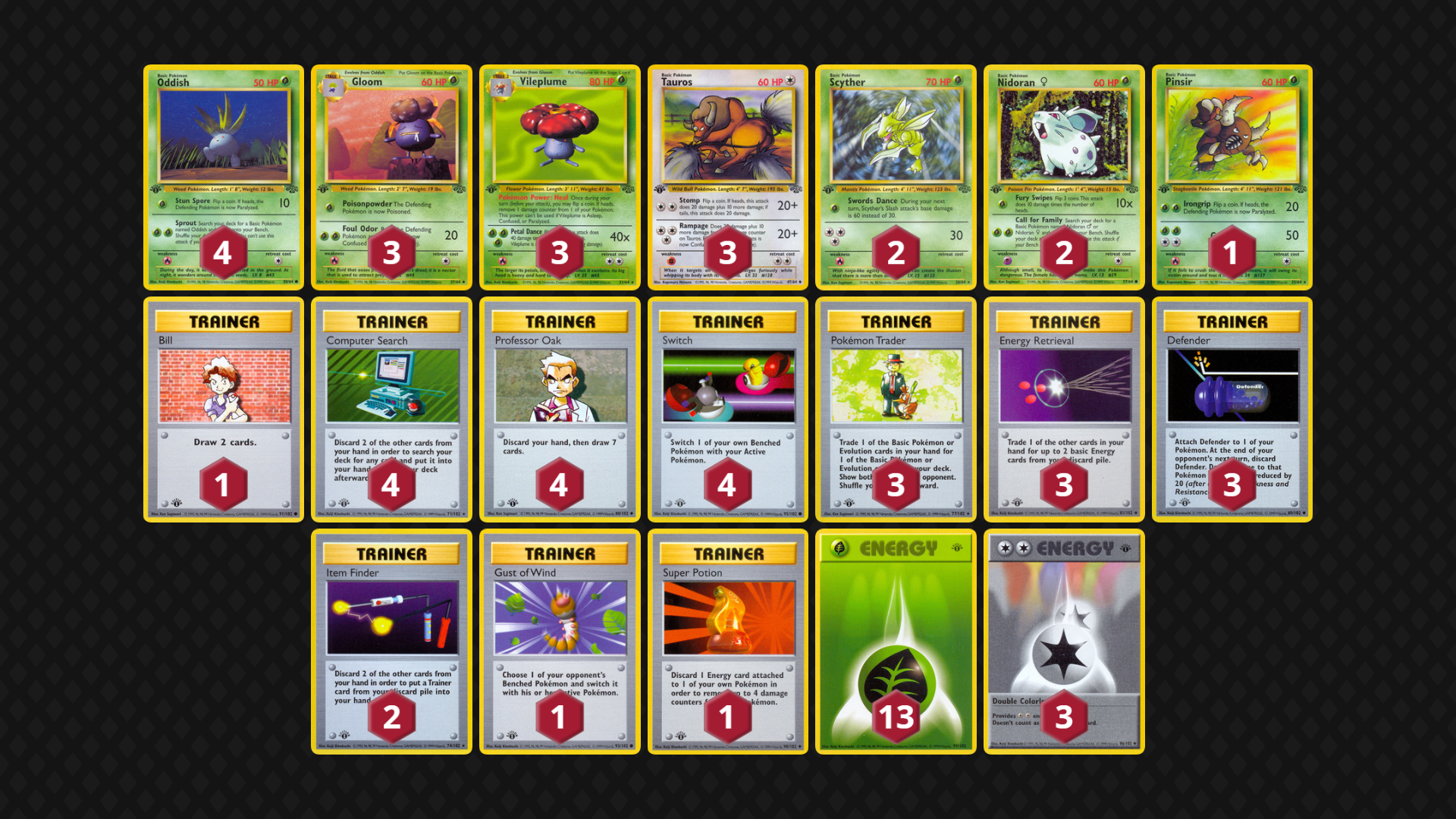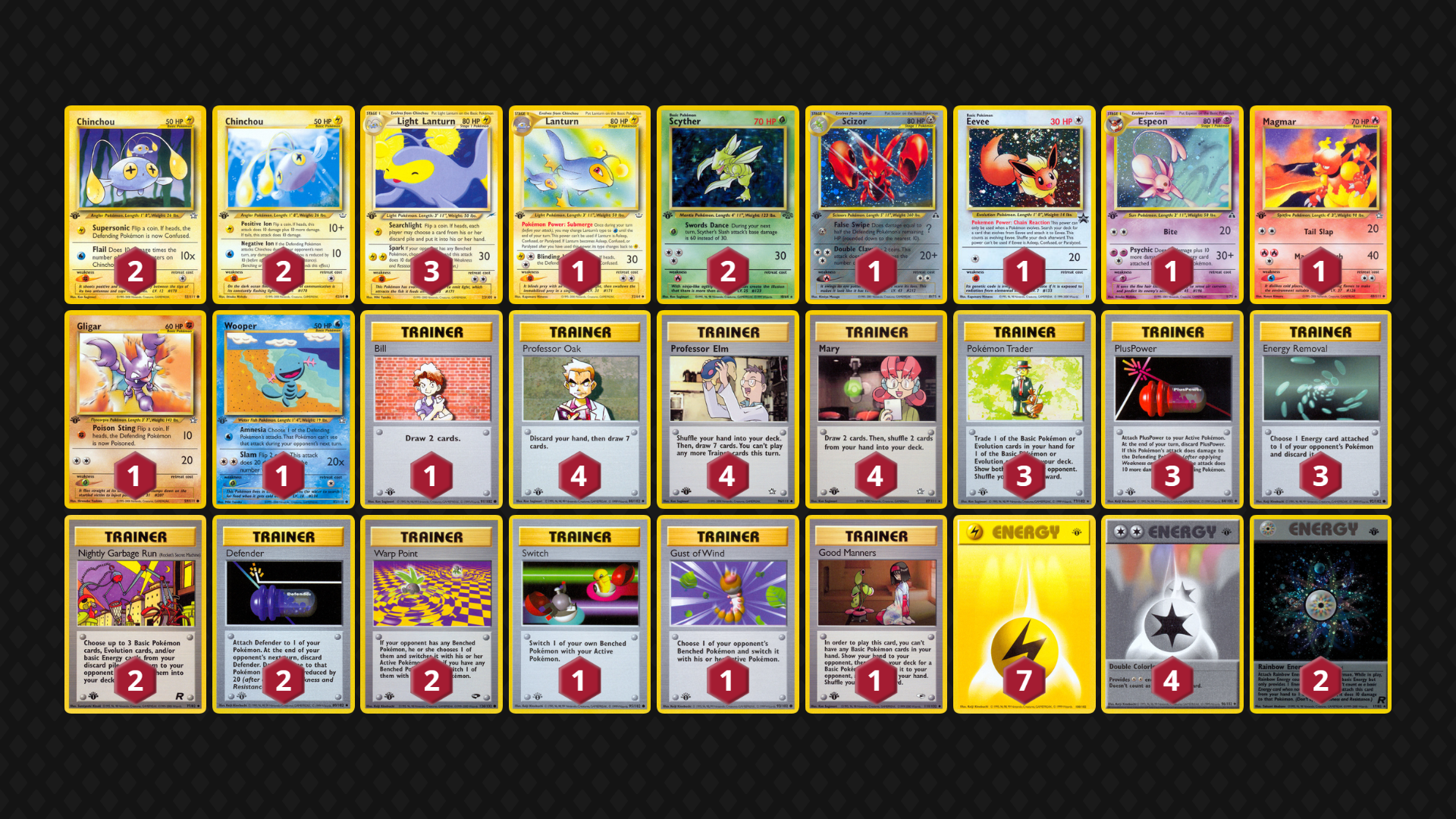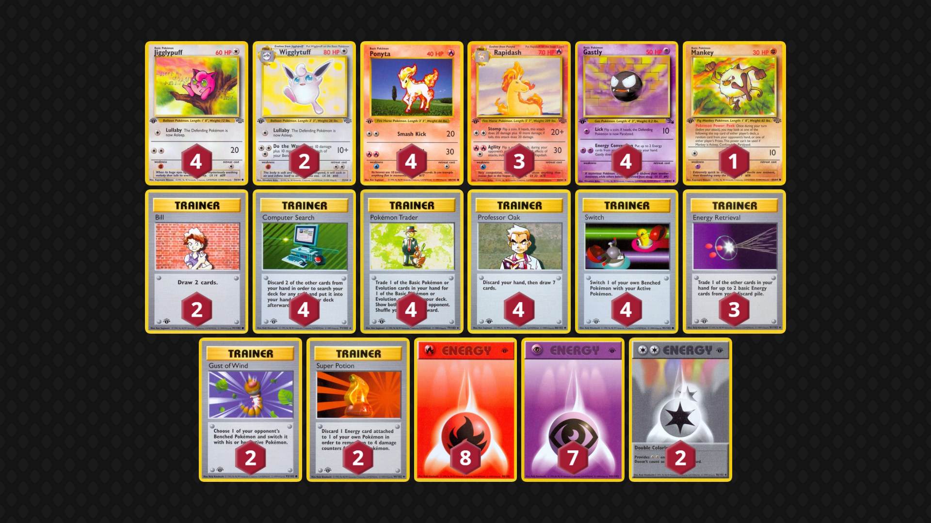 My approach to deck building has been: at least 9 Basics (of 14-16 total Pokemon), 16-17 Energy and approximately 15 consistency-boosting Trainers. Look for Pokemon that cover one another’s weaknesses (and support a general strategy, especially when leveraging Pokemon Powers/Abilities/Bodies). I also prioritize ways to Switch out my active Pokemon as well as include Super Energy Removal and Gust of Wind in every deck.