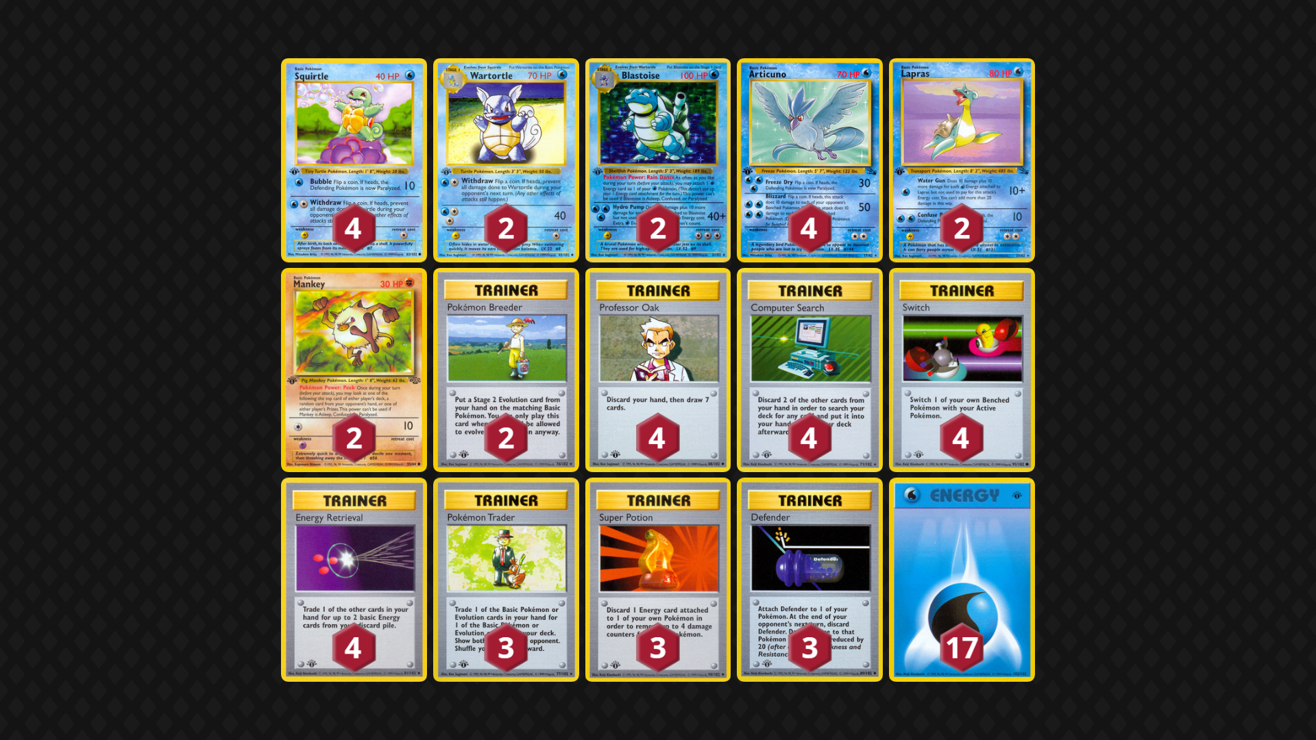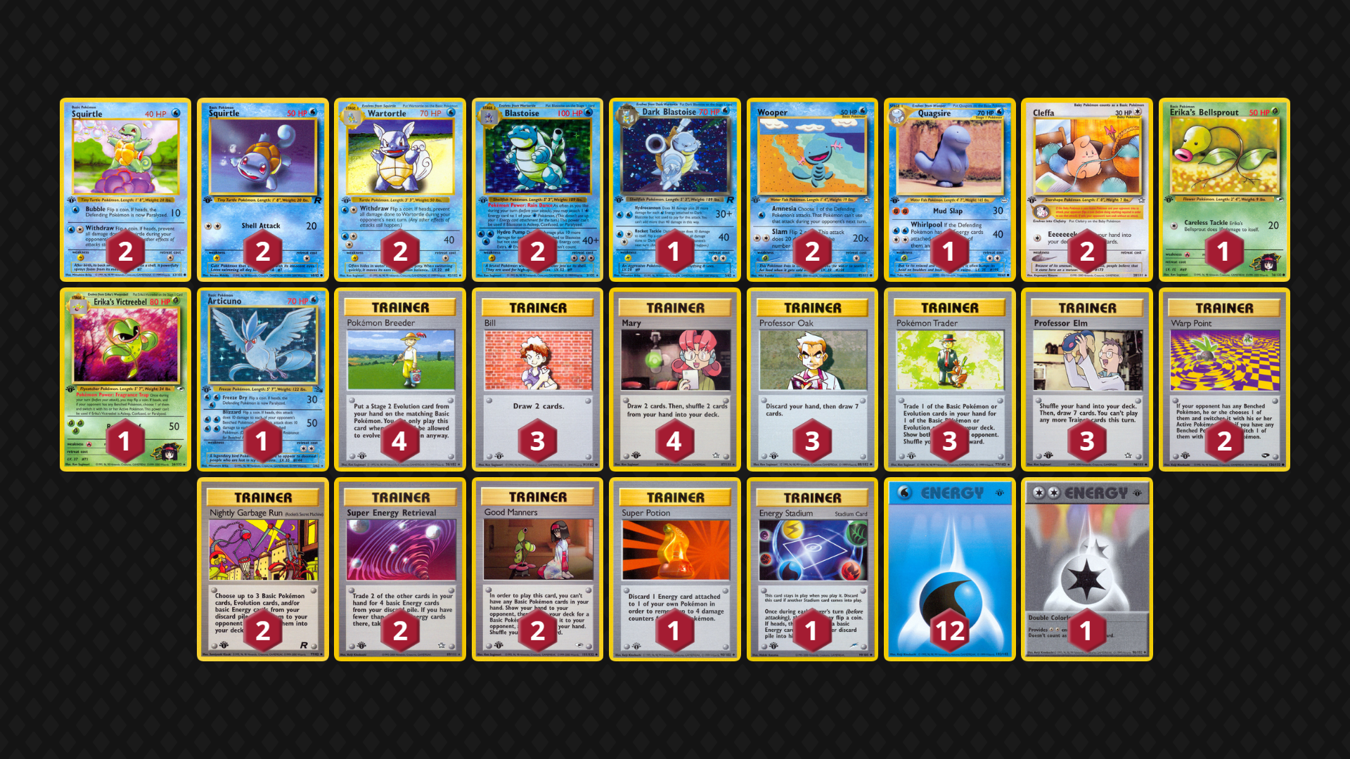 Blastoise’s Rain Dance is a much-beloved effect for Gen 1 enthusiasts, and it’s no surprise that the card is fun in WotC GLC! While Feraligatr is a tempting partner, I’ve stuck to Stage 1s and tried to have more than a few Mon that won’t get eaten up by Lightning attackers.