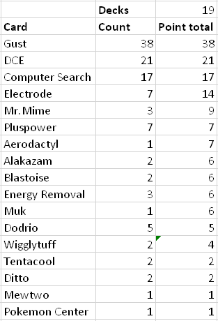 • How to handle generically good (most efficient effects, like Dodrio, Double Color Energy (DCE), Gust of Wind, Electabuzz, Clefable) cards? I believe this is a diversity-related question, which is tied to the “Spirit of Format” discussion.
