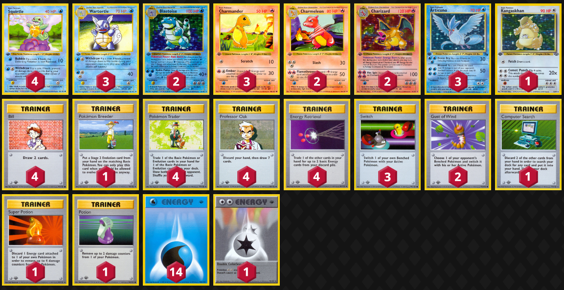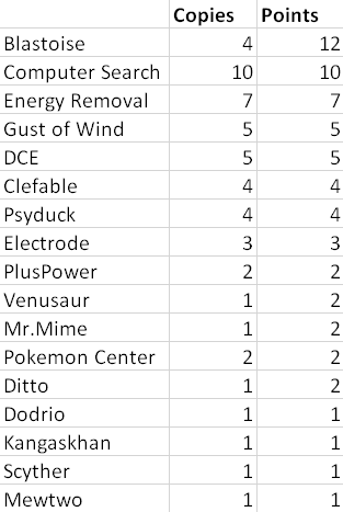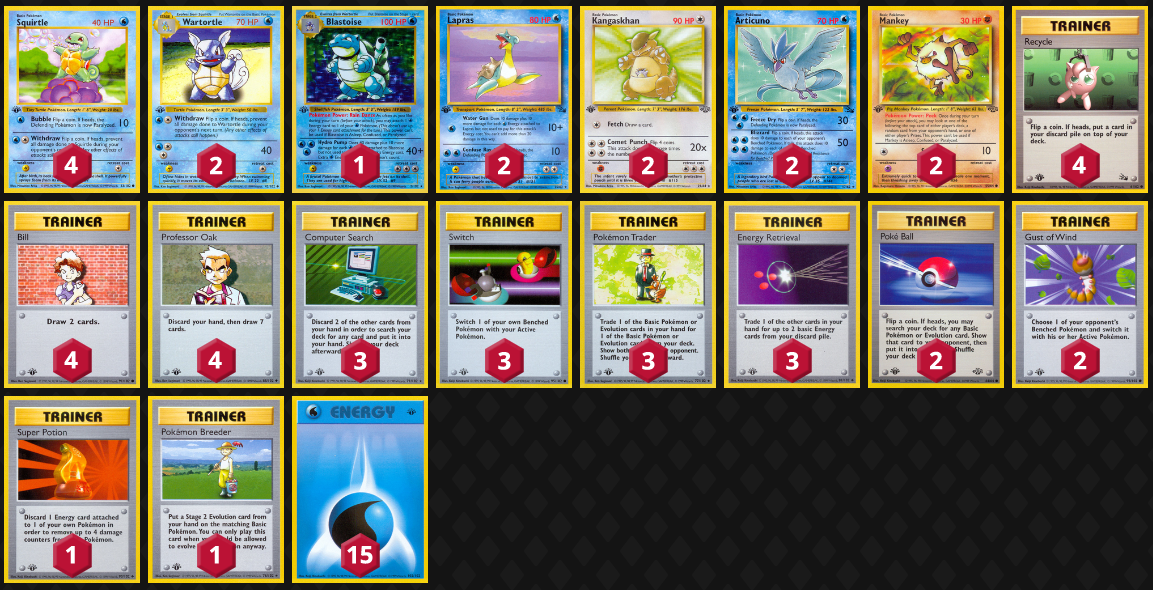 • Points: 2x Blastoise (4 pts), 2x Gust of Wind (2 pts), 1x Computer Search (1 pt), 1x Double Colorless Energy (1 pt)