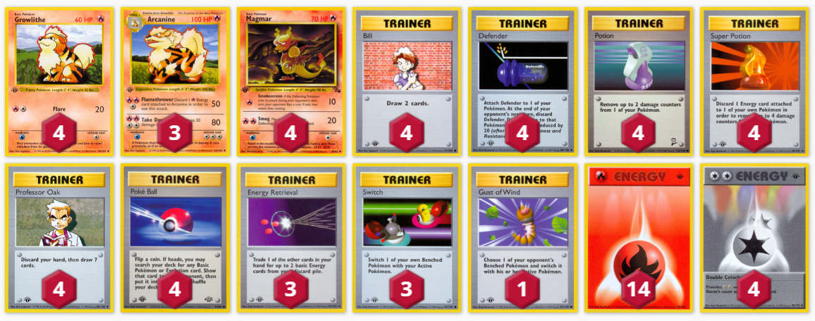 • Points: 3x Arcanine (3 pts), 2x Gust of Wind (2 pts), 3x Double Colorless Energy (3 pts)
