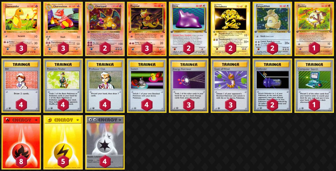 Dark RaichuKoga’s BeedrillSabrina’s VenomothMisty’s PoliwhirlCharizardCharmanderMisty’s GolduckDark MukBrock’s SandslashLt. Surge’s RaticateDark SlowbroBlaine's Tauros